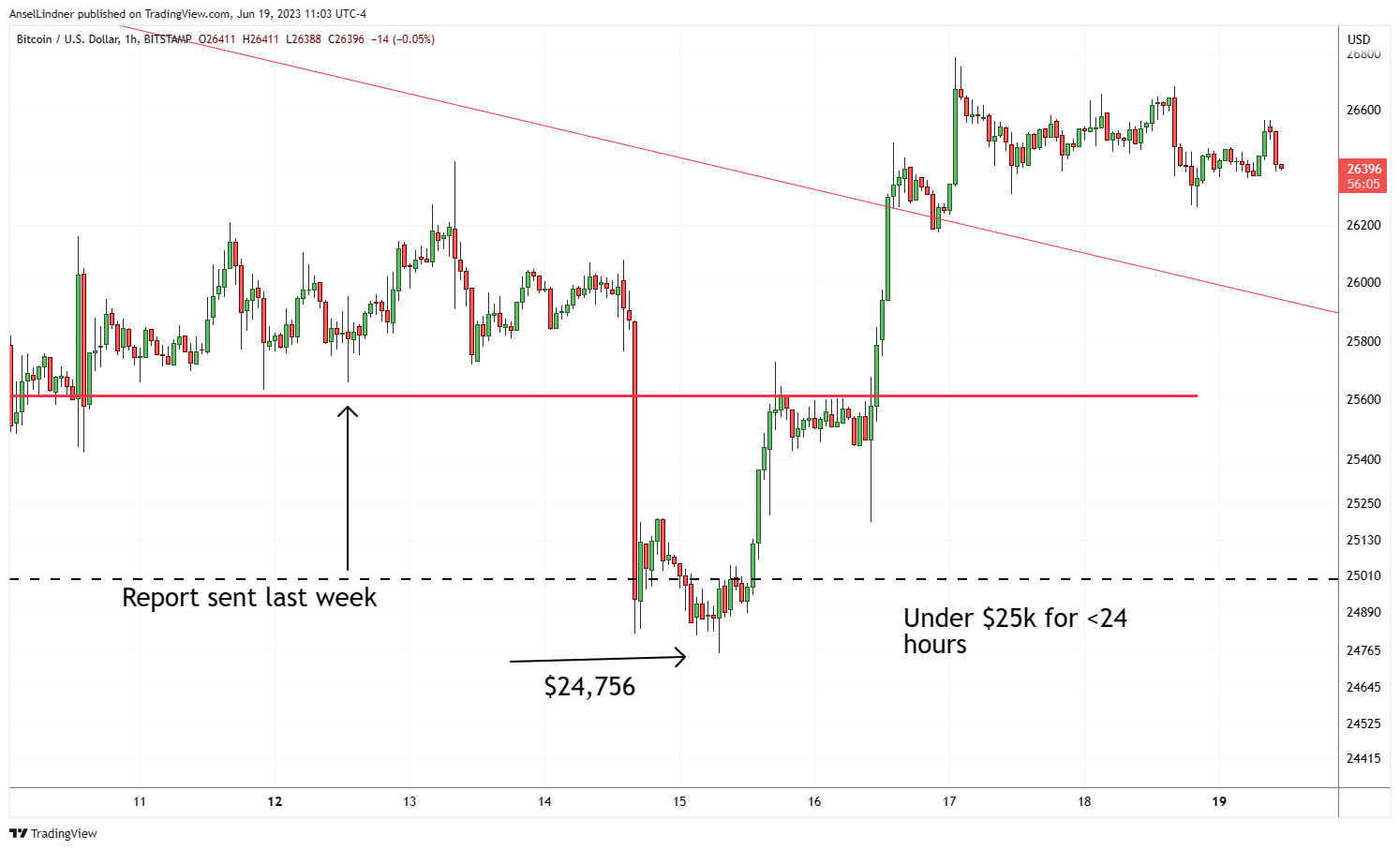 I missed the bottom by $6. It hit $24,756 on Bitstamp. It has not rallied all the way to $28k yet, but that is coming.