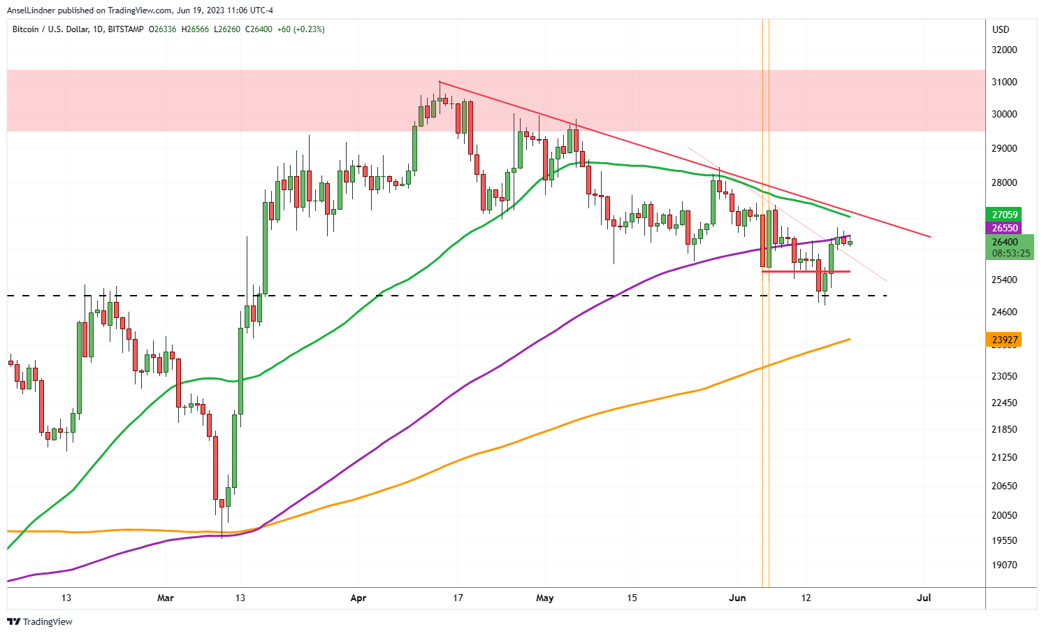 There is an increased risk of more downward price action, but not sustained price drops. Fake outs could occur around $25k. For instance, the price could drop to ~$24,750 for a couple hours and rally right back to $28k.