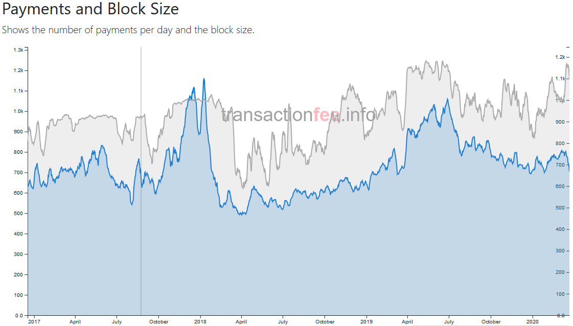 Here's a long term view of Bitcoin's payments and block size showing block size near ATHs despite the mempool being relatively empty. Also note the recent decoupling as number payments per block decreases as the size of blocks increases.