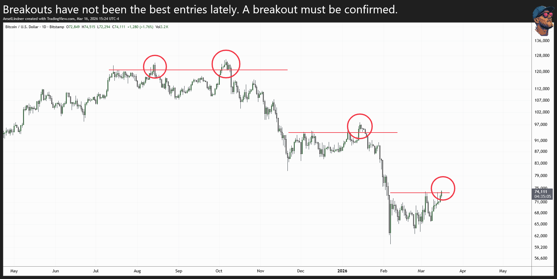 In recent history, simply buying a breakout hasn't worked very well. We need additional confirmation. Those near-term hurdles I pointed are the levels to watch. I'll turn full bullish above $77,000.