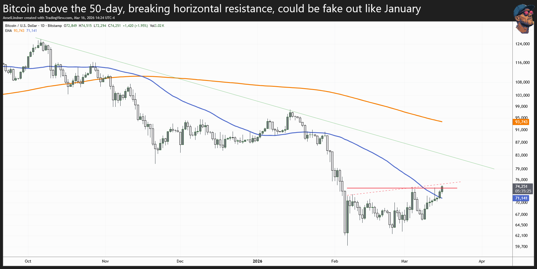 Technically, bitcoin has now moved back above the 50-day moving average. That’s an encouraging development, but by itself it isn’t enough to declare a fully bullish breakout. We saw a similar situation back in January, when price stayed above the 50-day average for a short time and even broke some horizontal resistance, but ultimately failed to sustain momentum. So that possibility still exists.