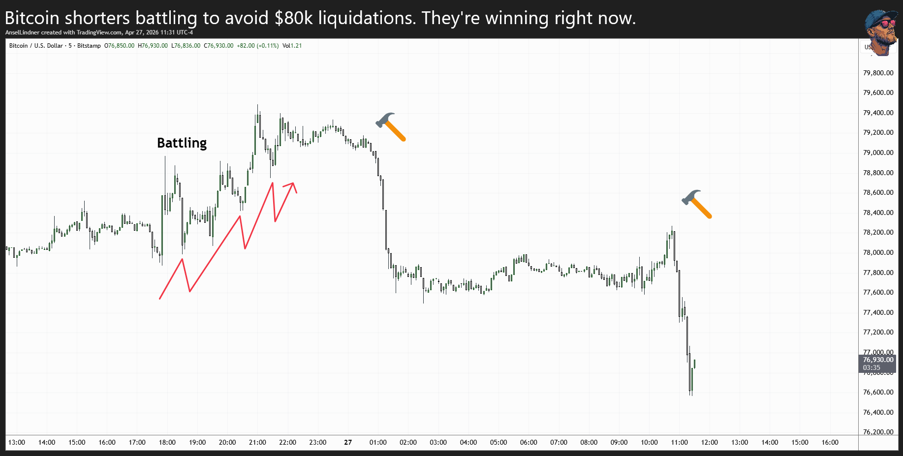 There is a battle going on in the bitcoin market today. After the futures market opened last night, there was some significant back and forth. It looked like things had calmed down around midnight above $79k, but shorts came in and hammered the price down. Then, throughout the early morning hours, it looked as though longs might once again be able to push the price higher, when shorts came in again and hammered the price.