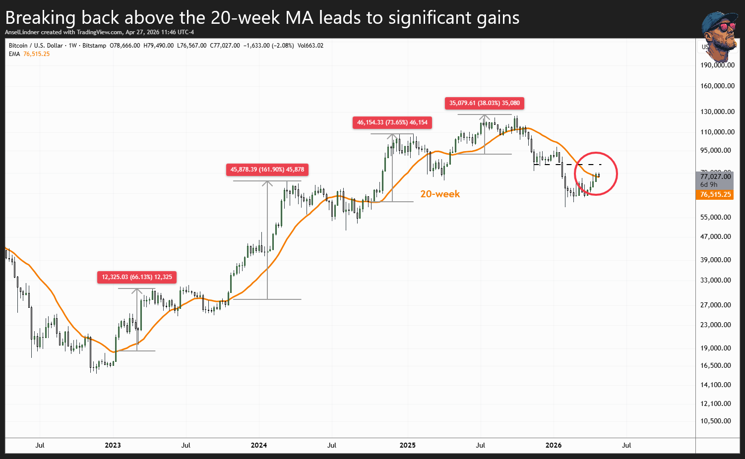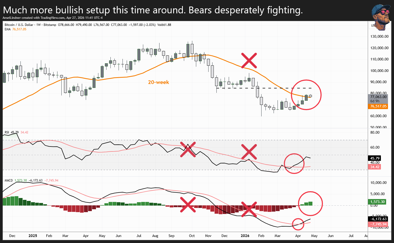 This breakout is unlike the one in January. It is the best setup bitcoin has had on the weekly chart in years. Price has pushed above the 20-week MA, RSI crossed bullish out of March's oversold conditions, and MACD has finally turned bullish.