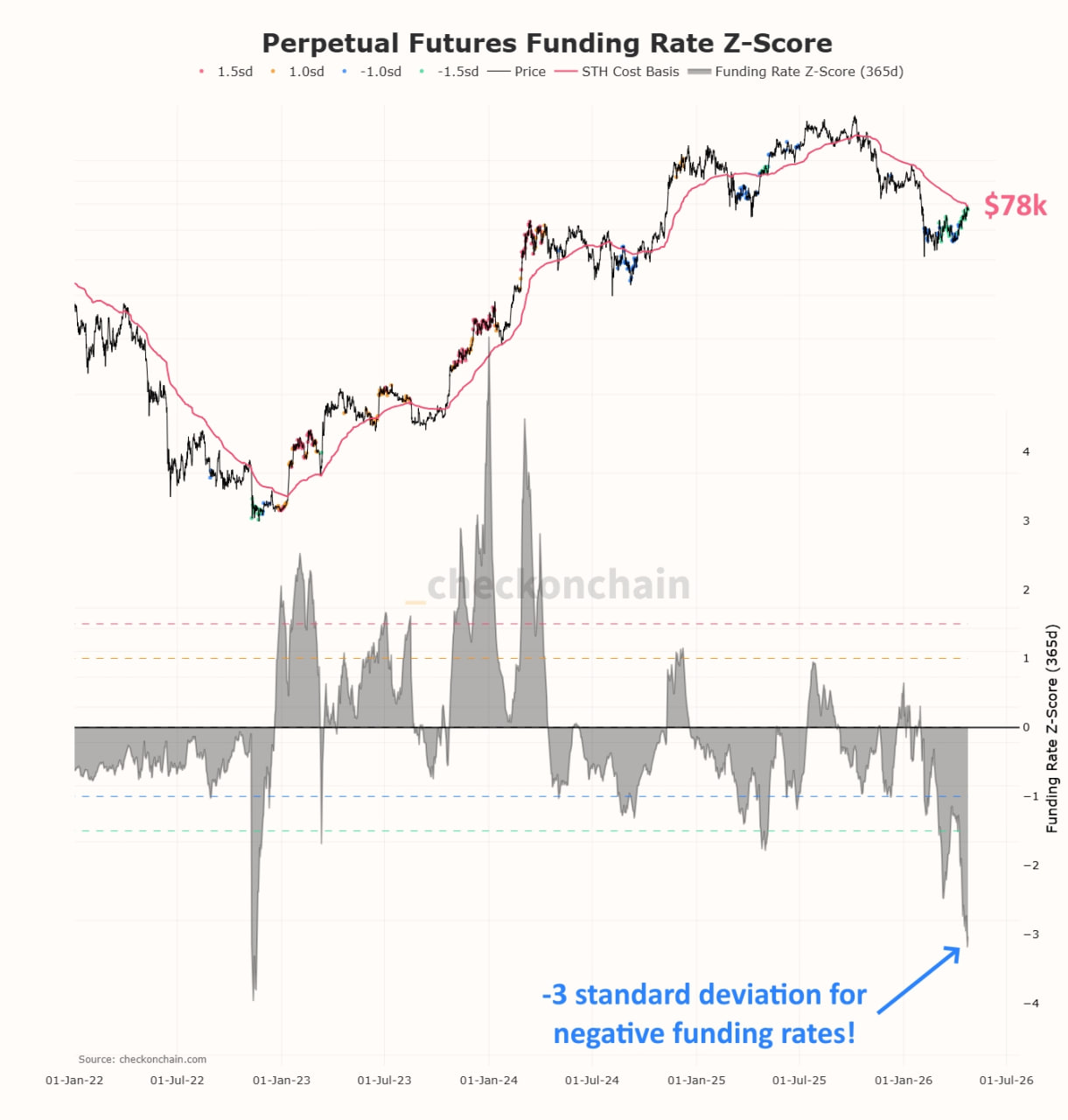 Funding rates remain a major signal of volatility. They are currently hitting 3 standard deviations below the mean during a period of rising prices. This is highly unusual behavior. The only other comparable instance in recent years was during the FTX collapse, but that episode was short-lived.