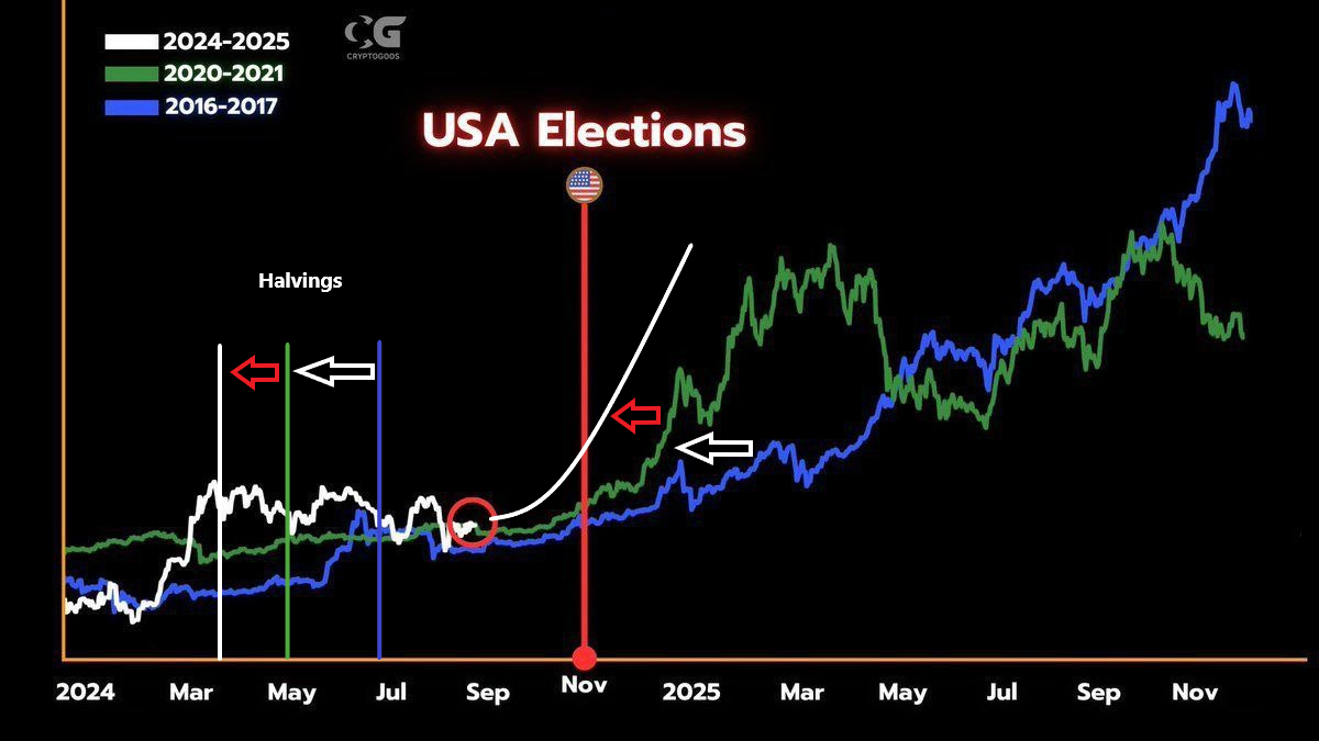 If we follow the halving timeline alone, the price should start moving up and be well above the current all-time high by the next election—potentially reaching as high as $100,000. However, if the true driving force is a combination of the halving supply squeeze and the U.S. elections, then the price would likely remain relatively flat, without a major breakout, until after the election.