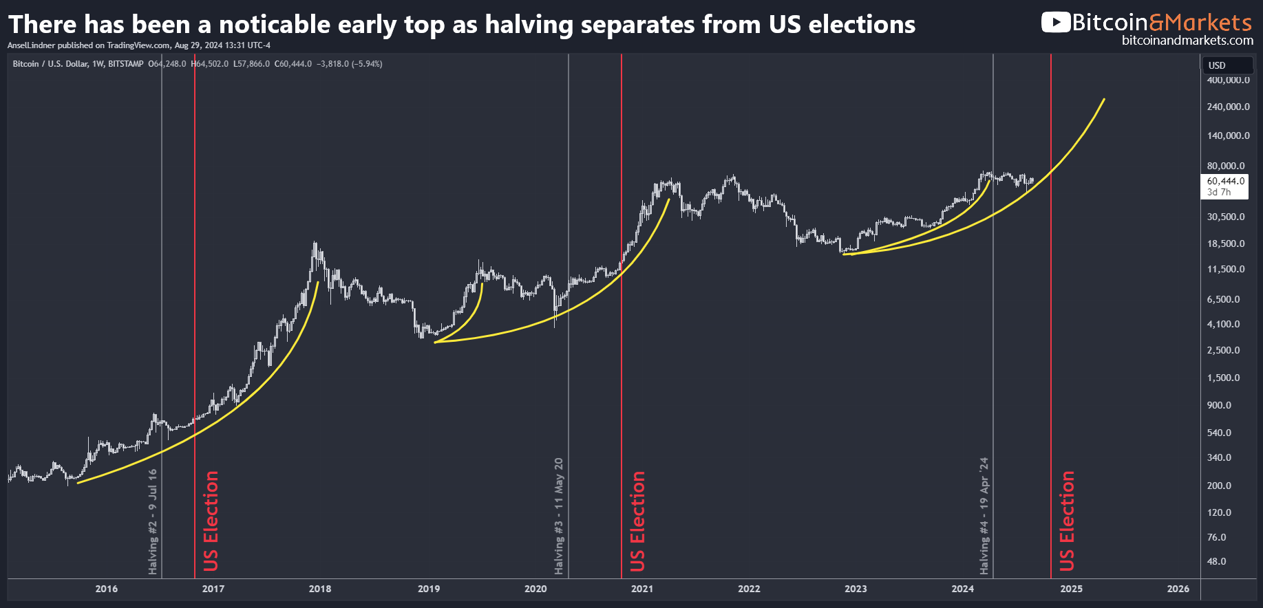 The separation of the halving and the US elections might have some indirect impact on Bitcoin's price, leading to an early significant peak before the halving. We observed this pattern in both 2019 and 2024.