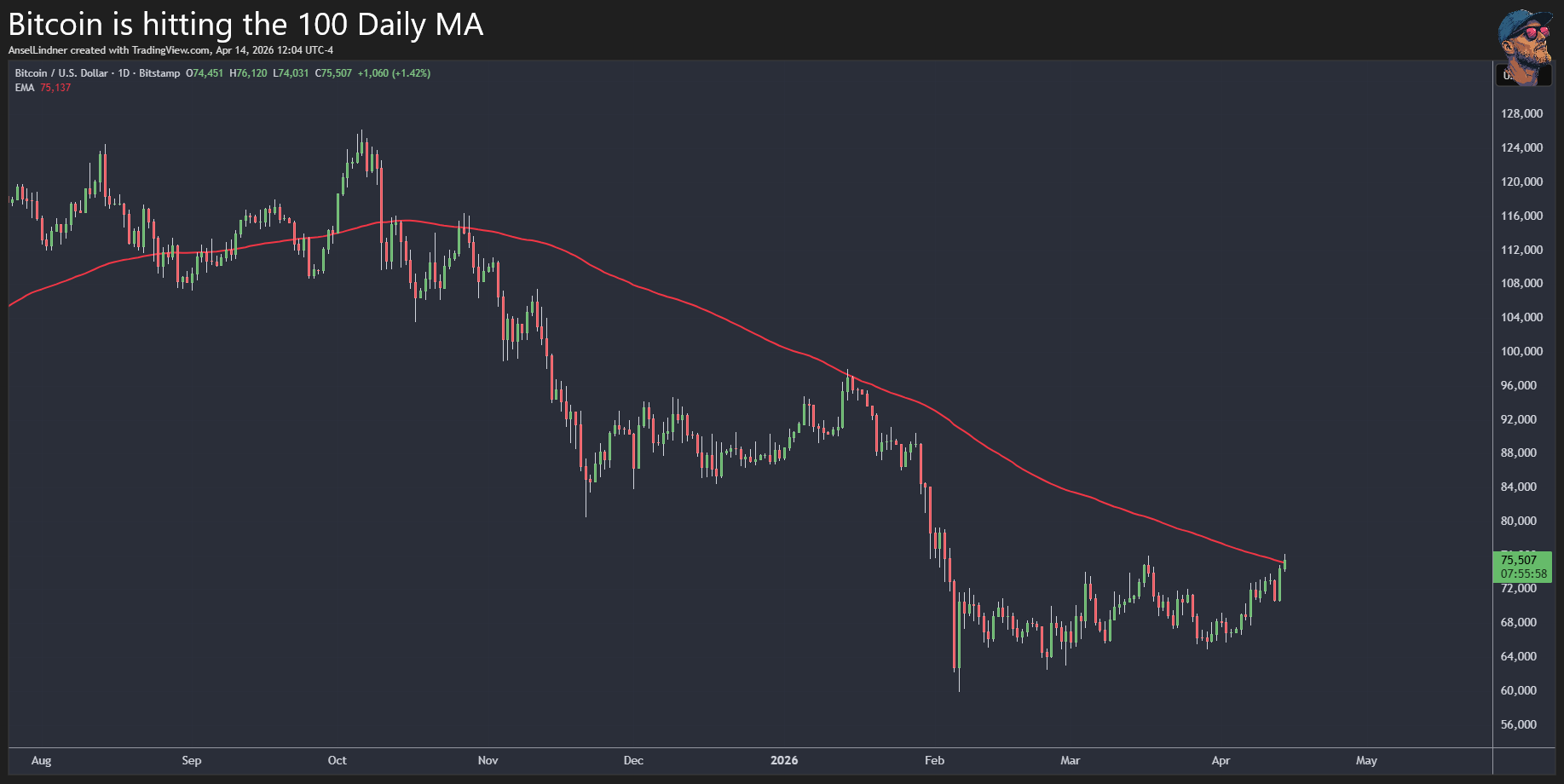 Along with breaking the linear downtrend, bitcoin is also attempting to break the 100-day MA. Interestingly, the 100 DMA also marked the top of the January bounce.