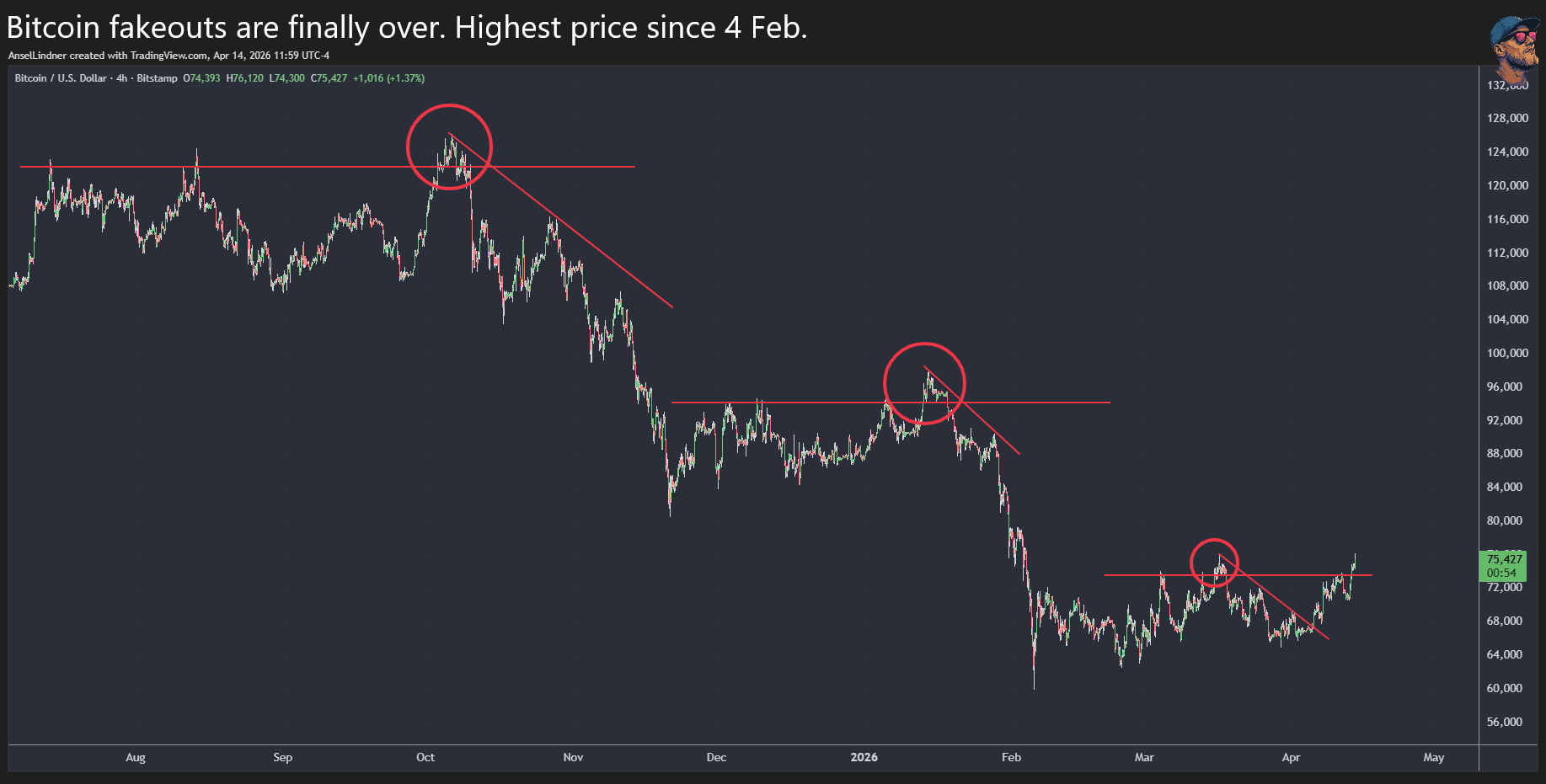 This move also broke the overall downtrend from the ATH last October. This is a beautiful sight to see, but follow-through is key here. We need to see the price continue up to $81k to make this breakout legit.