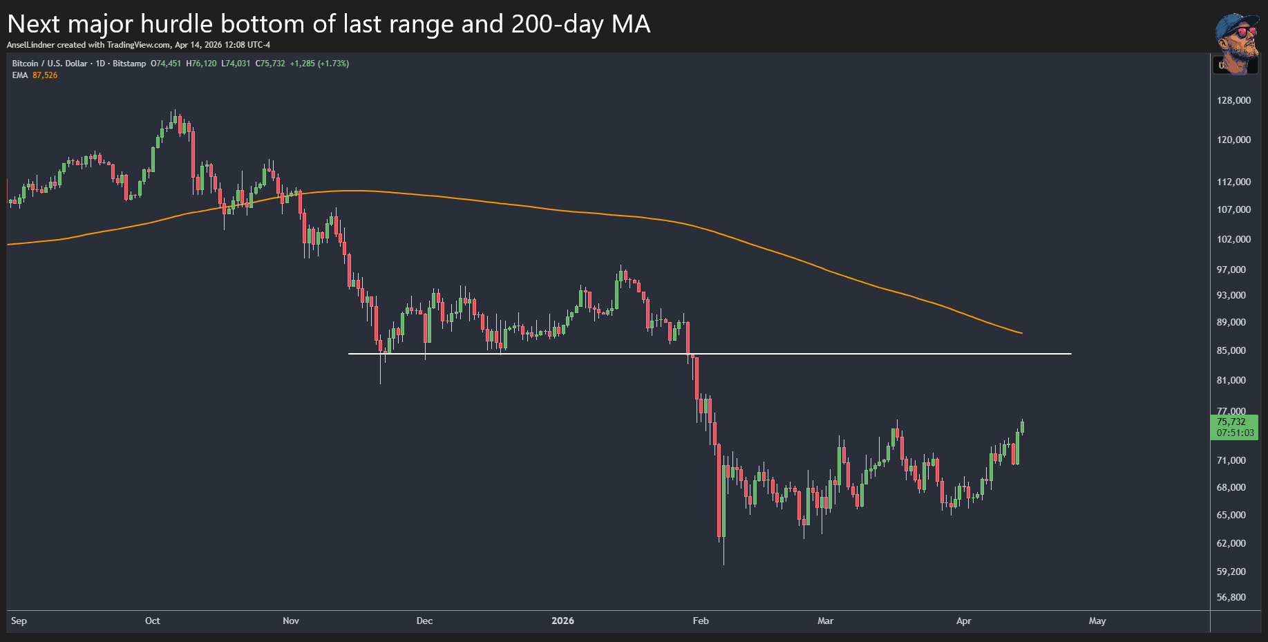After clearing $81k, bitcoin is going to have to get over the hurdle of $85,000. That is the bottom of the last stair-step range, and will also line up with the 200-day MA in a few more days.