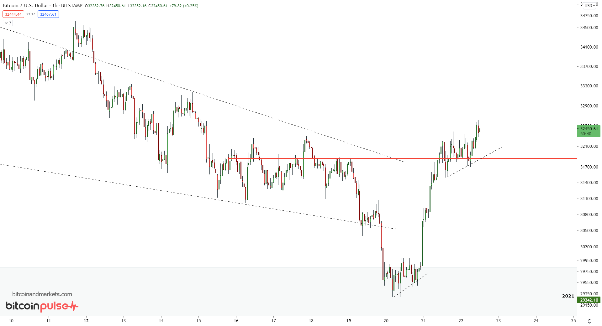 On the 1 hour chart, the movement off the bottom was impressive and the importance of that red line becomes apparent. If price slips back below candles of the last day and closes the daily below the red line, that could easily signal a return to the bottom. However, at the time of writing, price might be breaking out to new highs.