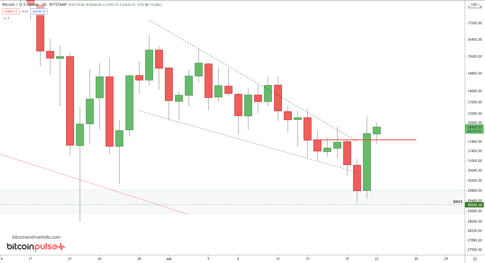 The daily appears to be picking a direction. It bounced almost perfectly off the 2021 open price, forming a higher low than mid-June and confirming heavy support.