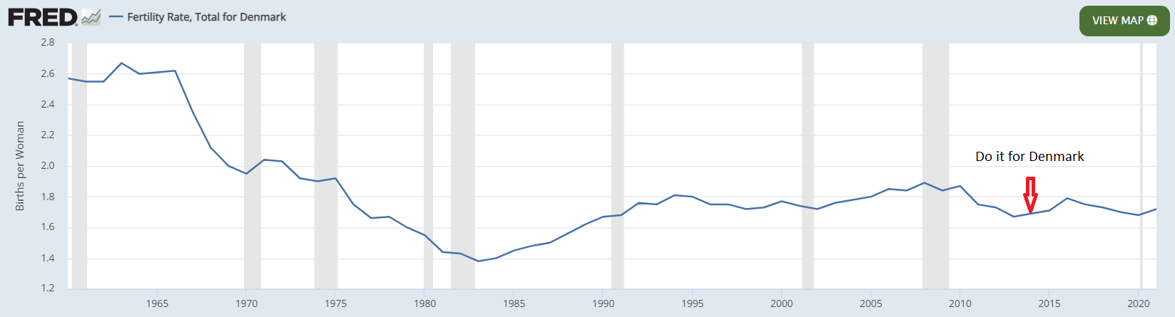 That's a complex web of benefits. It's important to note here too, these programs started back in 1967 with the implementation of the first Child Care Allowance, so they are not new. In 1985, paid maternity leave was introduced at 75% of salary for one year. The results have been the same each time. The programs had a brief one or two year bump in fertility, followed by a resumption of the decline.