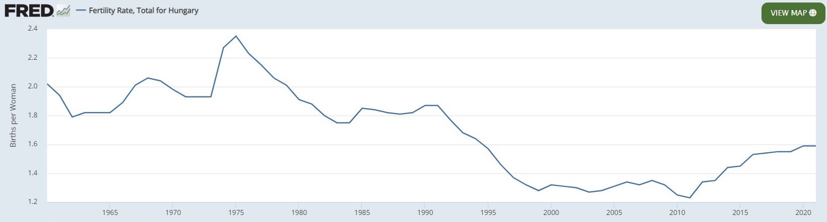 From a low of 1.23 in 2011, the fertility rate has increased to 1.59. That is a 23% increase, but still very far below replacement of 2.1. The effect is also waning as the fertility rate plateaus under 1.6. There is also some debate about a quirk in the math for Hungary's Total Fertility Rate. It has been said that the rise since 2011 is an artifact of delaying the first child and how that effects the formulas.