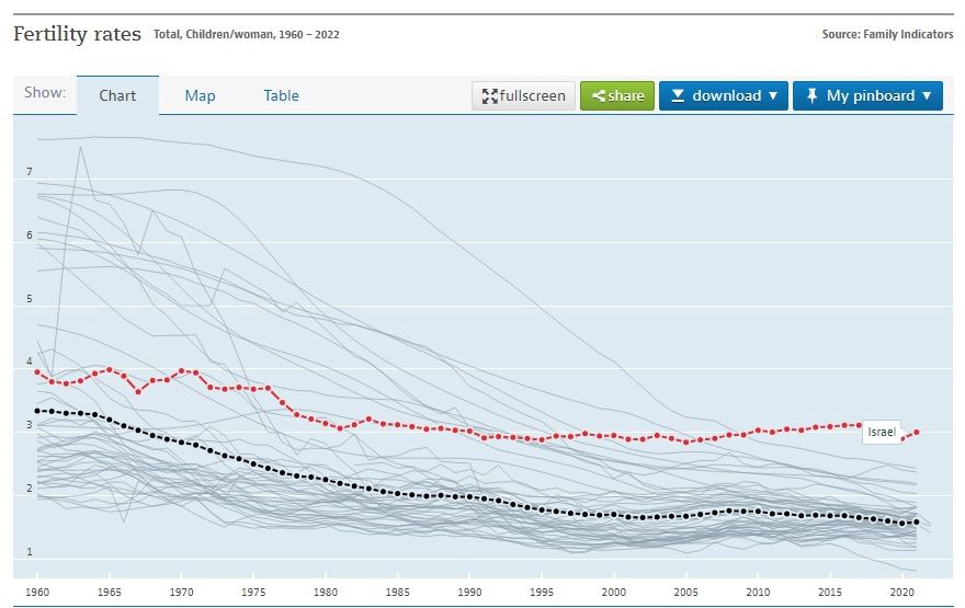 It is important to not put too much emphasis on the Israeli success, because it is unlikely to be replicated in other places. What's happening in Israel directly contradicts what we see in other countries. It is also not an example of how to RECOVER from significant sub-replacement level fertility, because they never slipped below it in the first place. No society in history has ever recovered from a fertility rate significantly below replacement.