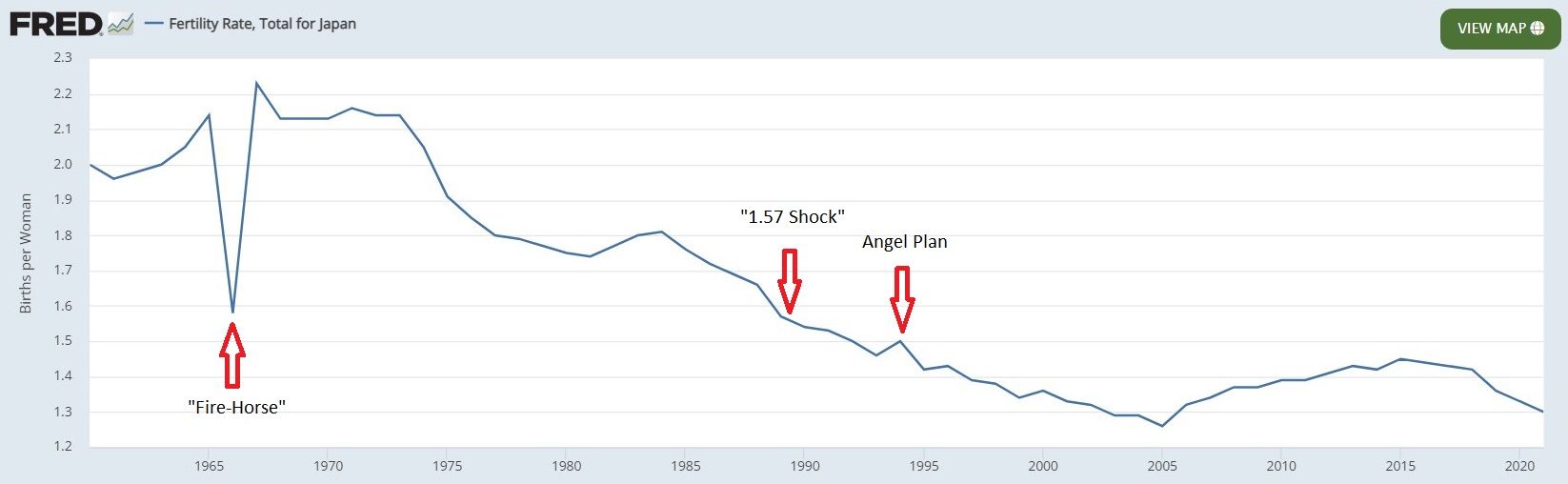 Public awareness of the fertility decline in Japan started with the "1.57 Shock". When the fertility rate for 1989 was reported, media headline across Japan reported on this record-breaking low fertility of 1.57. The previous well-known record in the country was from 1966, a one-off drop in fertility in the year of the “Hinoe-Uma (Fire-Horse)”, a superstition that women born in that year will have a bad personality and kill their husband. The alignment happens every 60 years, so, breaking that record was truly shocking for the Japanese. The 1966 drop is clearly visible on the fertility rate chart. I'll also note, the 1.57 Shock coincided with the Nikkei collapse of January 1990. I'm not saying they are connected, but could both be parts of a larger puzzle.