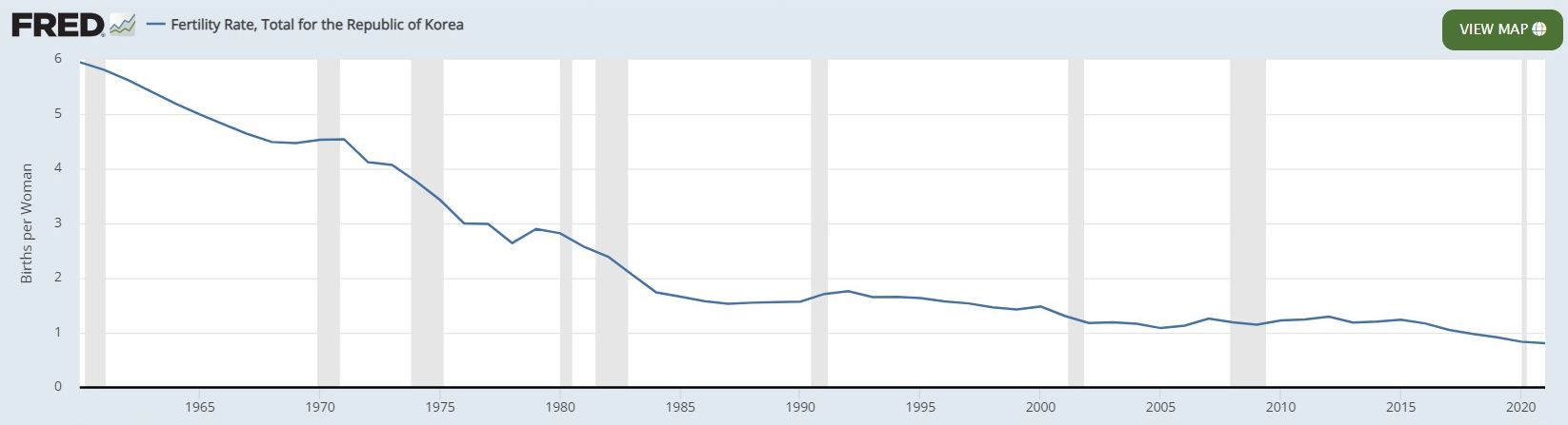 The excuses for not having children in South Korea are similar to other countries, career, cost, and so forth, but their is a dangerous undercurrent that is, perhaps, shared in other places but to a less extent - they are blaming gender inequality. In a Confucian society, traditional gender roles are heavily stressed, the women are tasked to take care of the kids and the house work. Studies have shown, in South Korea today in dual income households, the women spend four times more time doing housework than men. It would not be surprising to hear this kind of thinking early on in a demographic transition, but as fertility rates drop so low and the signs of the problem become keenly felt, traditional gender roles seem to rise in popularity elsewhere. We see this with the "trad-wife" movement in the US, the rise of conservative and populist movements around the world from South America to Sweden to India. However, in South Korea the scapegoat of gender inequality is only intensifying.