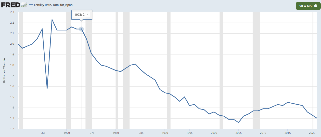 The documentary Birth Gap by Stephen J. Shaw presents recent demographic research, arguing that fertility declines are gradual but accelerate during economic crises. A notable example is 1973 Japan. Before the oil shock in October 1973, Japan's economy was booming, and fertility rates were above the 2.1 replacement level. The oil crisis, severely impacting Japan's energy-dependent economy, caused a significant drop in birth rates nine months later, pushing them below replacement levels, from which they never recovered.