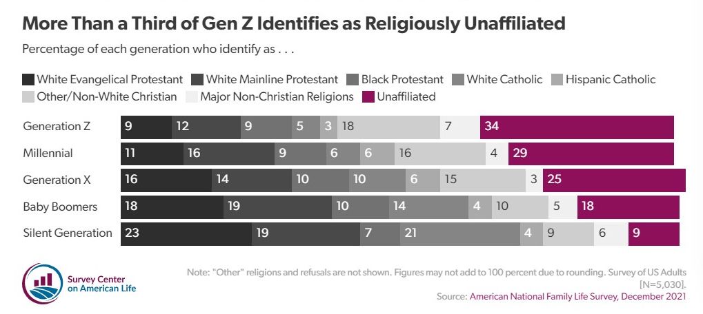 In another survey from American Survey Center, showed Millennials reporting no religious affiliation at 29% and Gen Z 5 points higher at 34%.