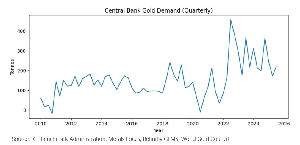 - Central bank demand has averaged closer to ~210 tonnes per quarter
