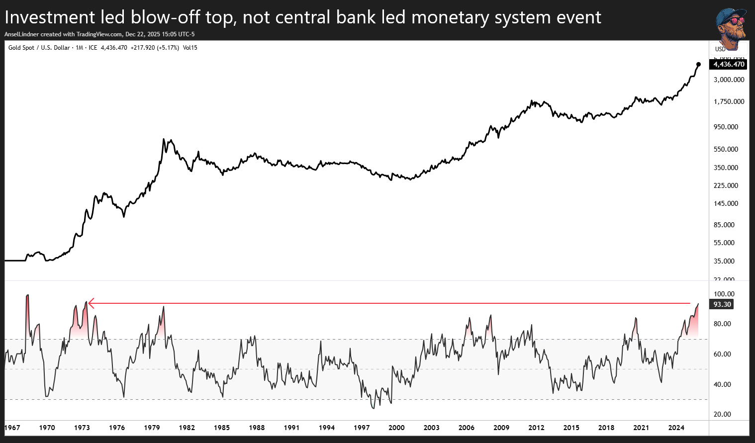 On the monthly chart, momentum indicators are stretched to historic extremes. RSI is hovering near levels not seen since the early 1970s, shortly after the gold window was shut. These are not conditions associated with the early stages of a structural bull market. They are conditions associated with late-cycle excess.