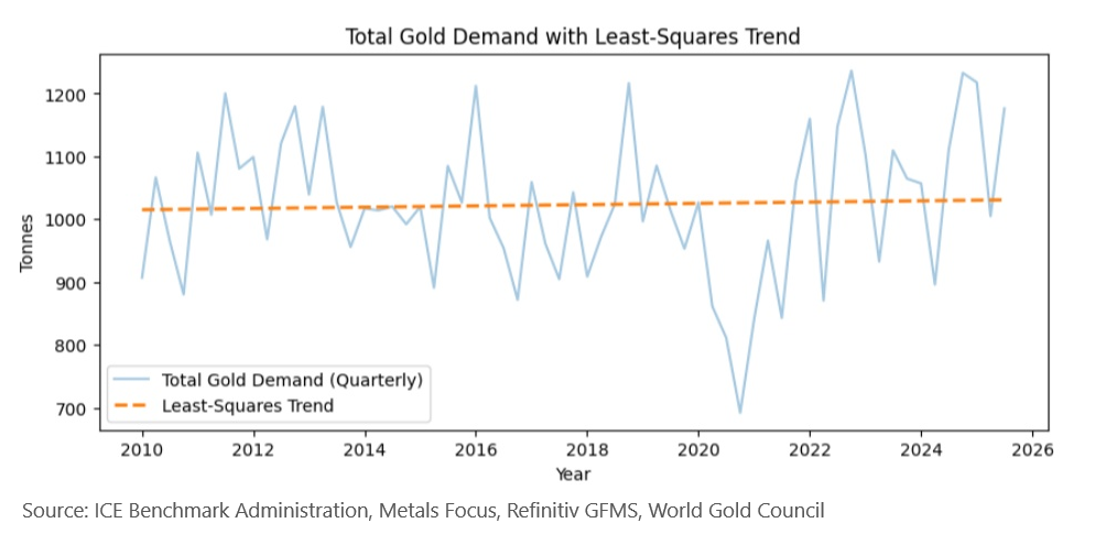 When we look at total gold demand going back to 2010 and apply a least-squares trend, a method designed to identify true structural direction, we find that total demand is rising by only: