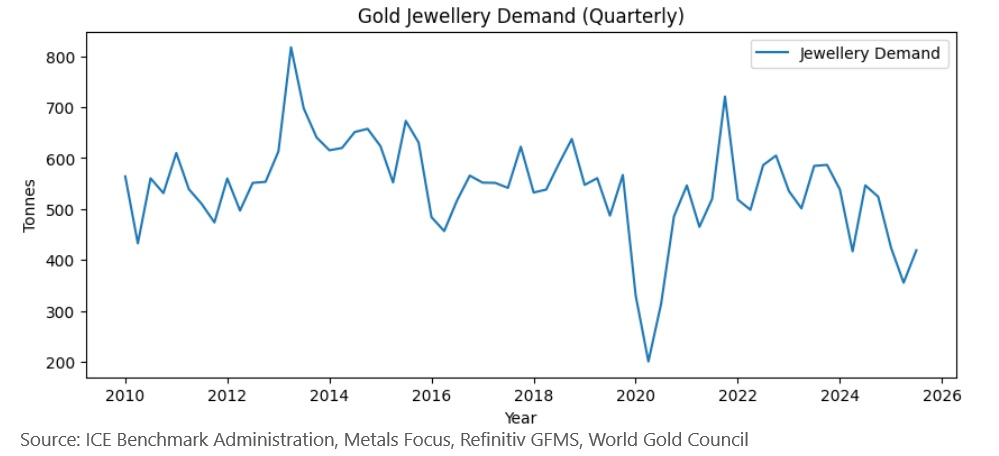 Gold’s rally is not being driven by central bank buying. Central bank demand is structurally higher than a decade ago, but it has been in a downtrend since the 2022 peak. Jewelry demand is falling. And total demand, measured objectively, is flat.