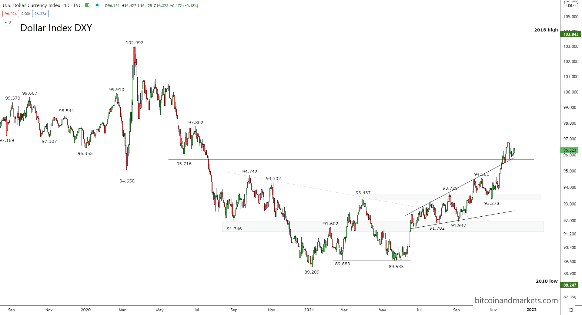Dollar has made its break out. Nothing stands between current levels and 100 on the DXY. There is a big story on the other side of the coin, and that's the Euro. We'll get into that a bit below.