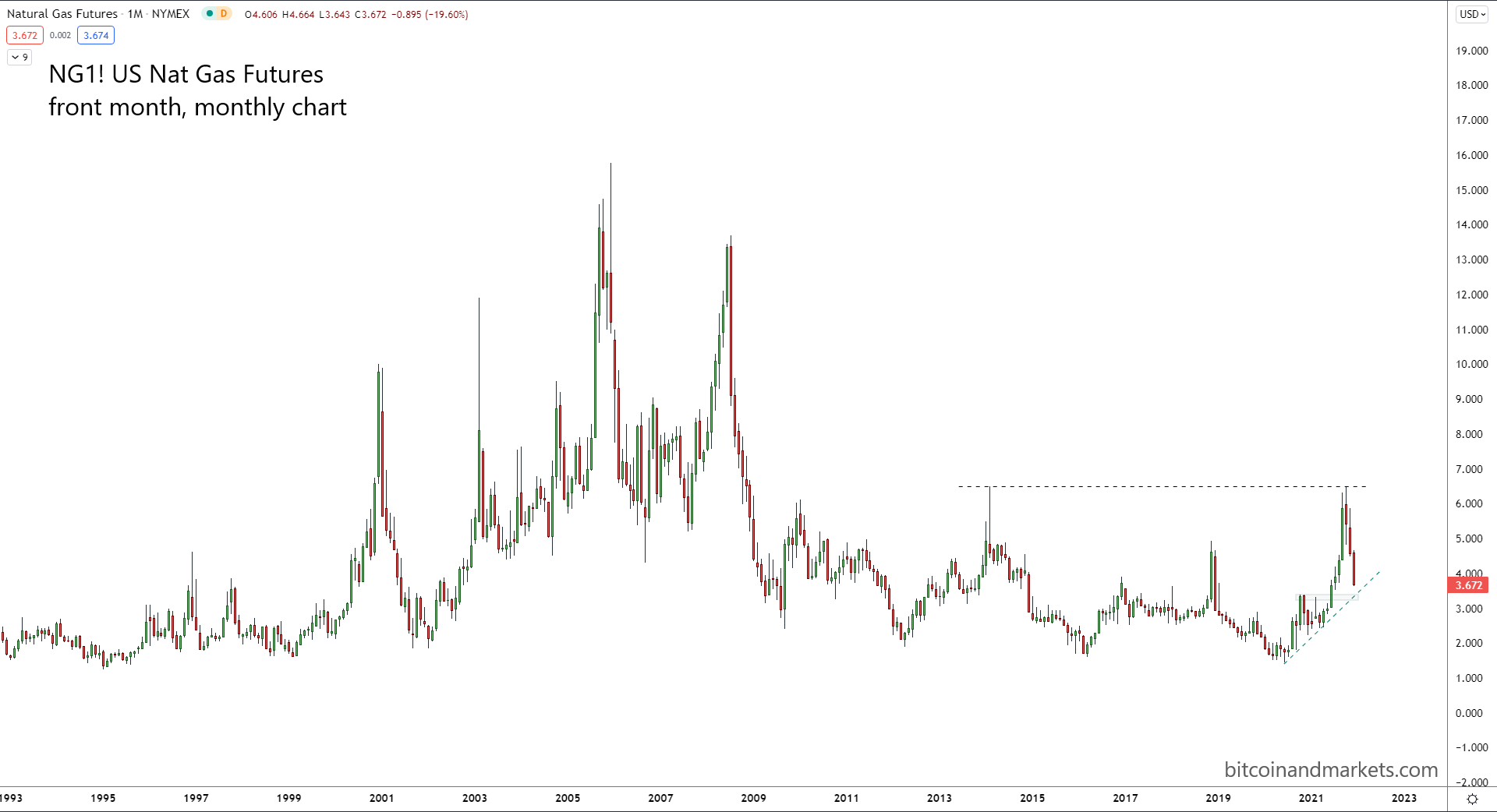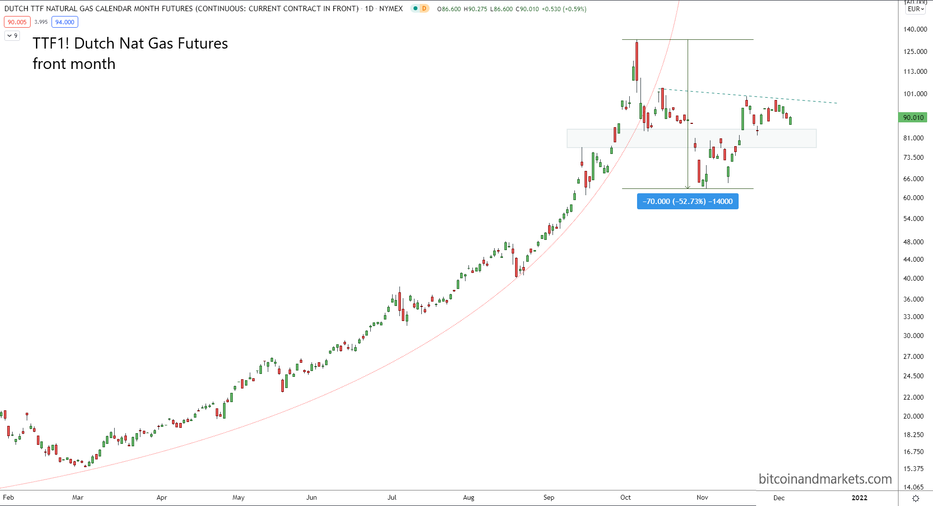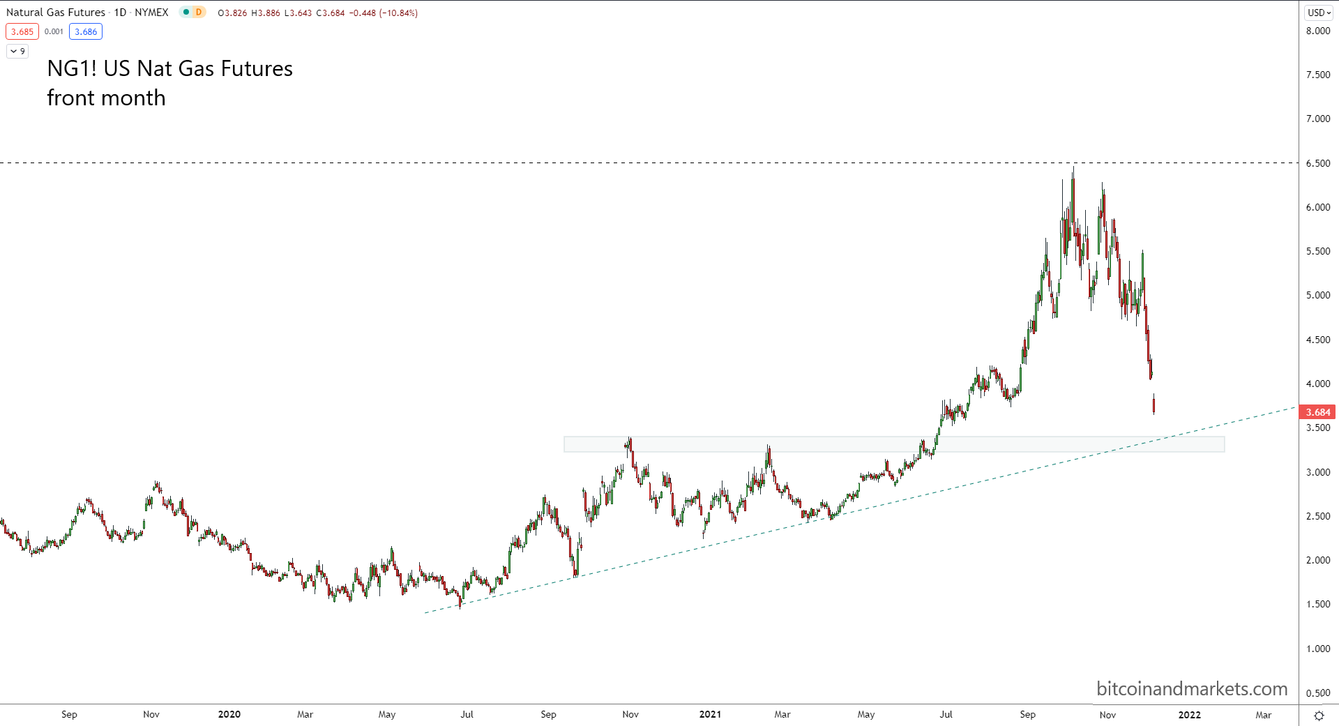 Checking in on natural gas in Europe first. Over the last month, we've seen the price jump back through resistance and has been holding above our identified area of interest on the chart. There have been, however, a series now of lower highs, signifying this move has less and less fuel behind it.