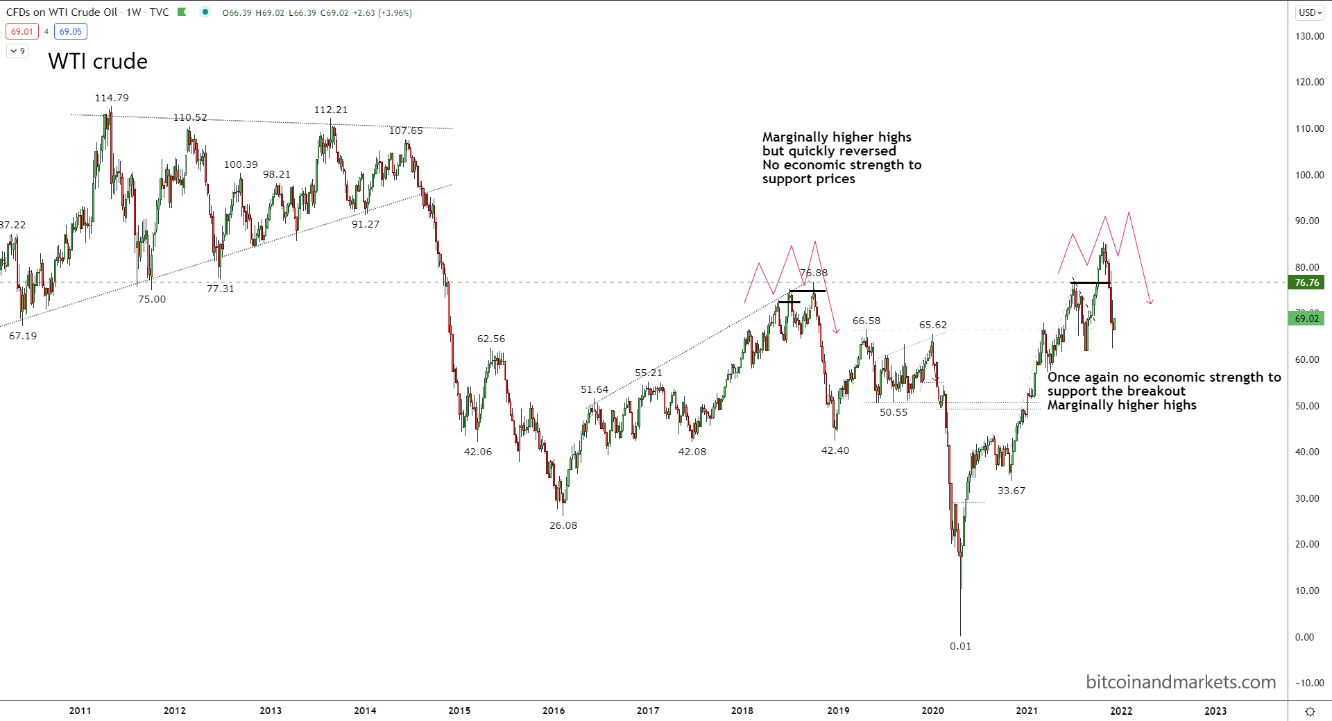 Imagine the oil price if Biden hadn't closed the Keystone pipeline. It would be A LOT lower. Again, the spike in the oil price does not signify inflation, it shows dramatic market disruption in supply. This is not more dollars chasing the same amount of goods, it's the roughly the same amount of dollars chasing fewer goods. When the US is pumping 13 mbd again, the oil price will be far below today's levels.