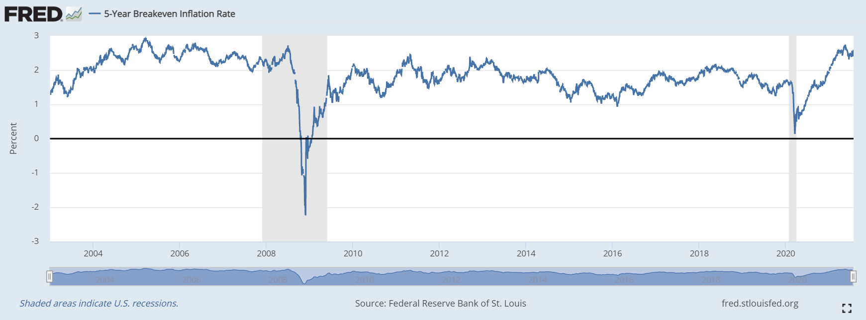 The 5y Breakeven is also down from its recent peak of 2.72%, but it did get closer to the pre-GFC normal. Still very far from runaway inflation.