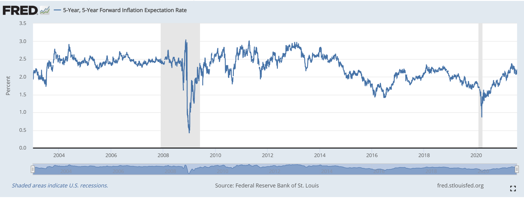 Lastly, to round-out this update, we take a look at inflation expectations. The 5y5y Forward is your standard inflation expectation measure for the economy, that’s from people with skin in the game. As you can see, inflation expectation never reached levels that prevailed prior to the Great Financial Crisis or in the year immediately after. The story directly from the market is that there is no runaway inflation in sight. The recent peak was 2.38% and headed down.