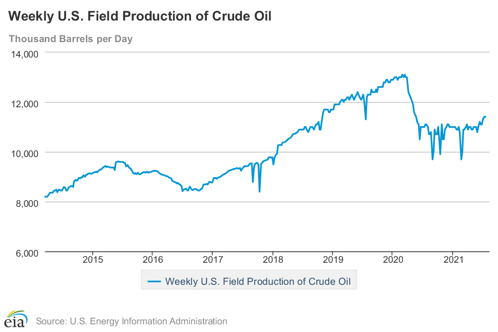 At the same time, US capacity is slowly coming back online. The average breakeven for shale is less than $60 / bbl according to an April ‘21 article by Tsvetana Paraskova of OilPrice.com, and oil production in the US (the world’s largest oil producer) is finally closing the production slack.