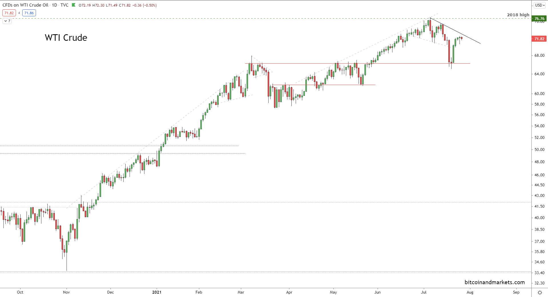 Oil is the most-traded commodity in the world. It is extremely liquid and difficult to manipulate. After the devastating negative futures price in April 2020, which caused widespread damage to the industry, price has been defying gravity, hitting as high as $76.95 / bbl on July 6th. This monster rally is not, however, a sign of inflation. It is a sign of the damage caused to the industry in 2020. The fact is, oil has struggled to recover to the 2018 high and was swiftly rejected, similar to how the dollar neared the 2018 low and bottomed.