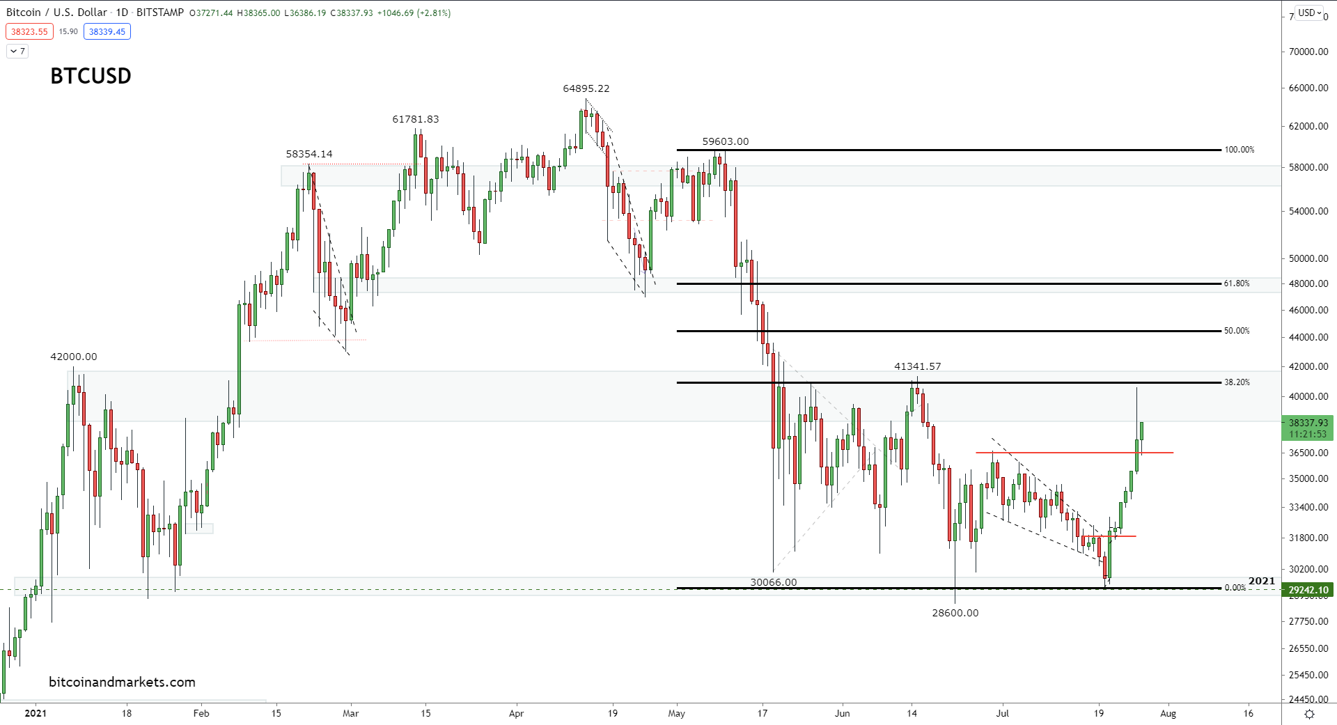 Bitcoin rallied hard yesterday. While some people attribute it to the fake Amazon news about accepting bitcoin on their platform, the charts had been approaching a decisive point for weeks. Hash rate is recovering, the network is stable, and the GBTC unlock of July 17th came and went. Uncertainty is waning and Bitcoin is ready to run. The scene had been set for any minor news event, like Amazon, to break the dam, allowing bitcoin to rise.