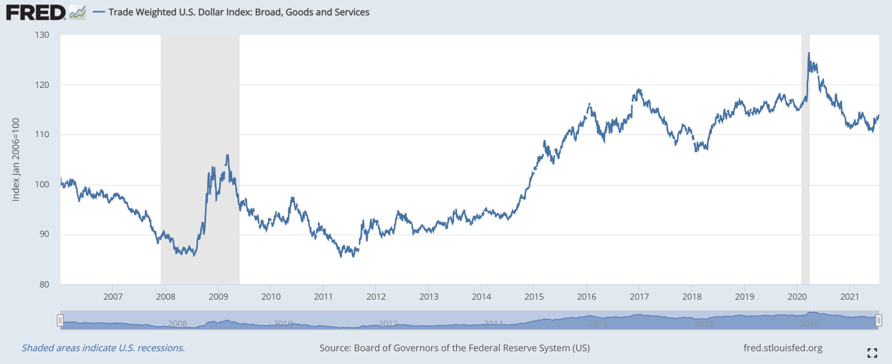 The decade-long trend of a strengthening dollar is yet more apparent on the trade-weighted dollar index.