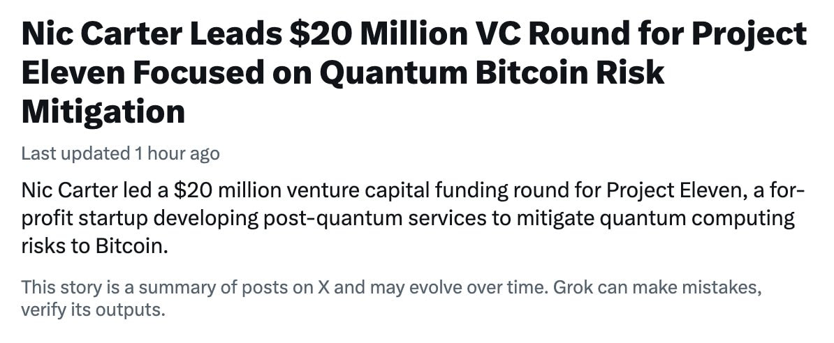 Some of the most vocal proponents warning about quantum risk benefit financially from amplifying it. It has recently come to light that one of the most prominent promoters of this risk, Nic Carter, led a $20 million funding round into a startup focused on quantum risk mitigation for Bitcoin.