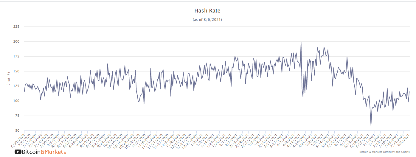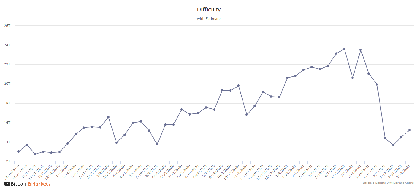 Hash rate has continued to rise in a stead manner. If you compare the recent slope of the recent rise to the typical slope from last year, you'll see it's roughly the same or slightly steeper. At the current rate of recovery, hash rate will be back to a new All Time High within 6 difficulty periods, or about 12 weeks.