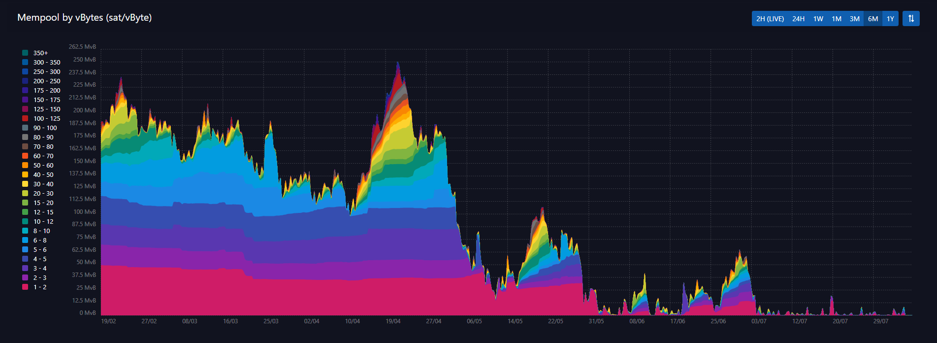 The mempool is still extremely low. This is the size in bytes of transactions that have been sent but not confirmed on the Bitcoin network. The more traffic there is on the network, the more transactions will be in the queue, and the higher the fees. A low mempool means cheaper, faster transactions (a plus), but because of low network usage (a minus). We will be digging into two theories of what's behind the drop in future posts, suffice it for now, here are two possibilities.
