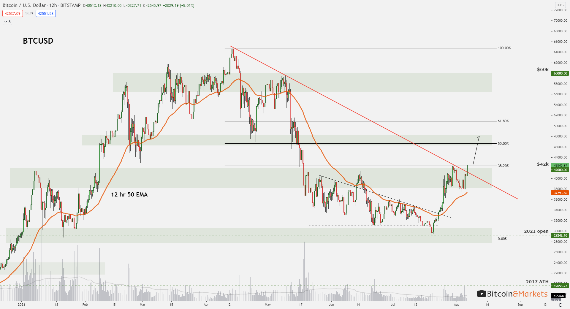 The bitcoin price bounced nicely on the 12 hour 50 EMA, which is quickly becoming the best timeframe and indicator of this move. The breakout above the fibonacci line and resistance area is very bullish. This should result in a quick move to the next level of interest, $47-48,000.