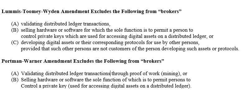Several Senators have jumped into action. Ted Cruz proposed an amendment that would scrap the provision completely (why this has been lost in the debate is beyond us). Then we have the competing new amendments. On one side is Coin Center with Senators Wyden, Lummis, and Toomey and on the other side Senators Warner, Portman, and Sinema. The two amendments are very similar, the only major difference being the Warner-Portman-Sinema amendment only exempts Proof-of-work mining as found in bitcoin.