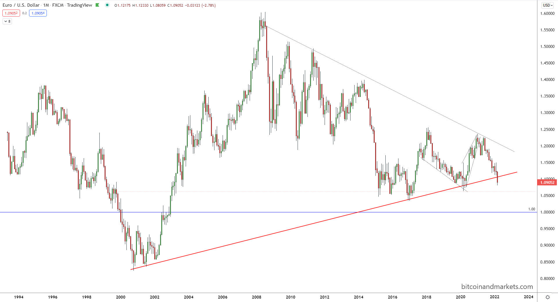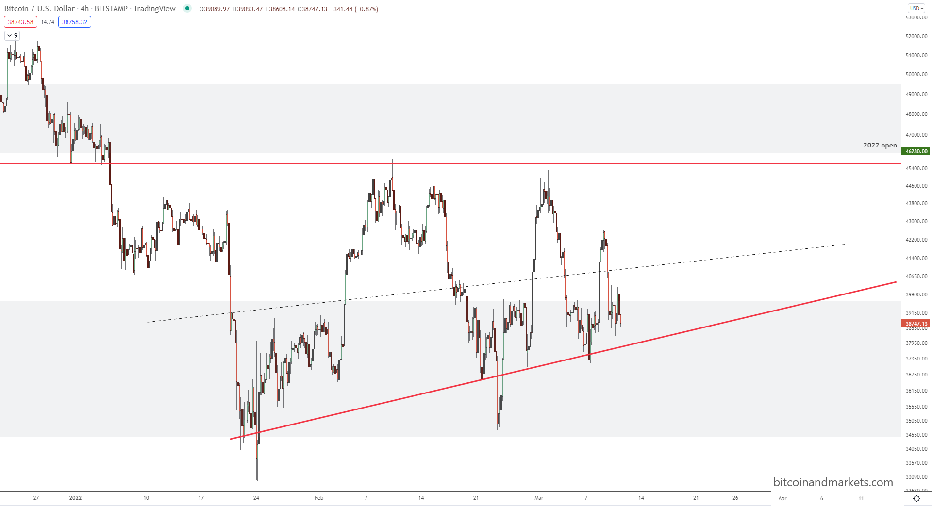 I am concerned about the two lower highs month and the fact that price has spent more time in the lower part of this pattern (below the dashed line in chart below). So, there is a minority risk of price breaking to the mid-30k's. More likely is a bullish recover back to $45k.