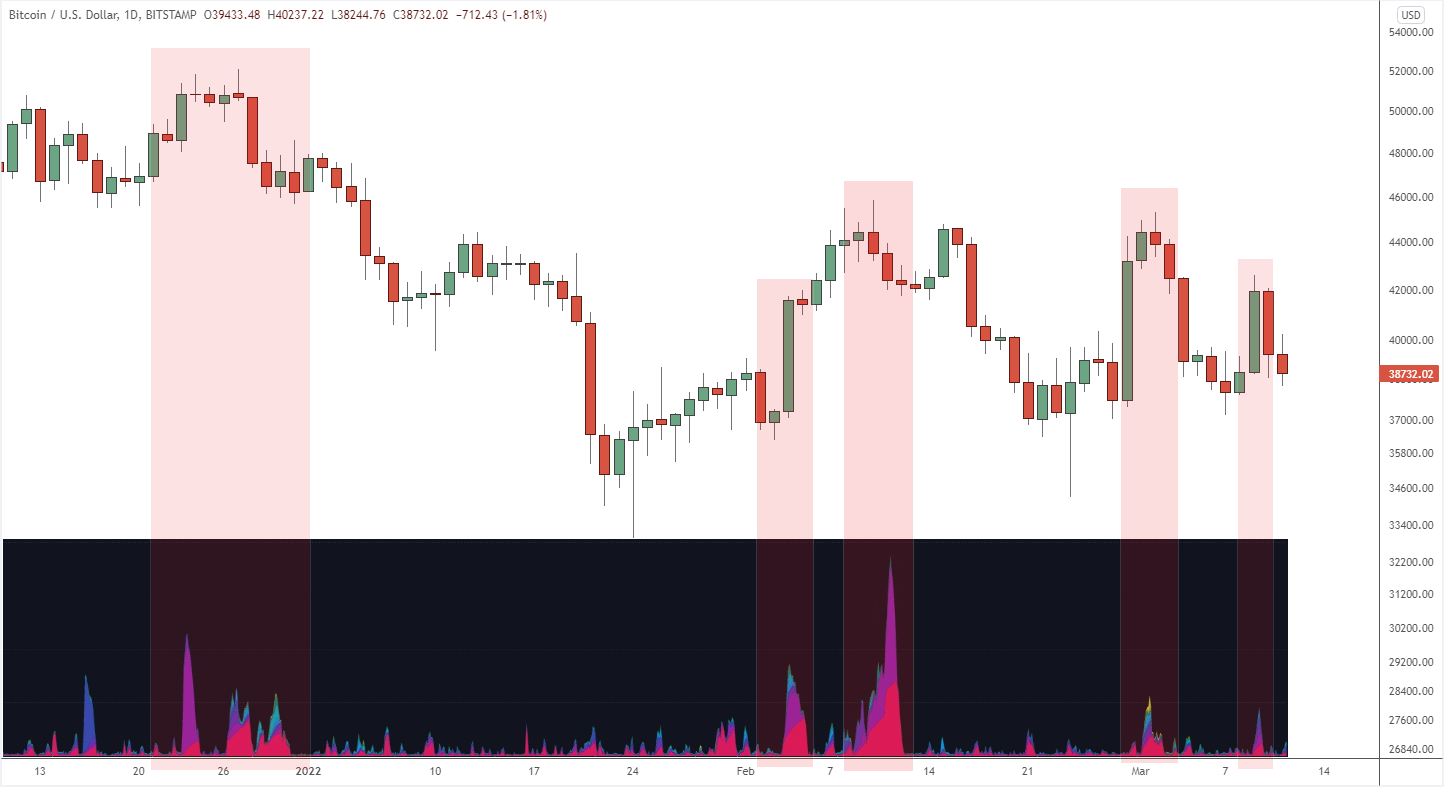 There is a spike in volume starting almost exactly where we have seen resistance in the last couple of weeks, around $46,000. The zone below price, from $34 - $38,000 also shows high volume support.