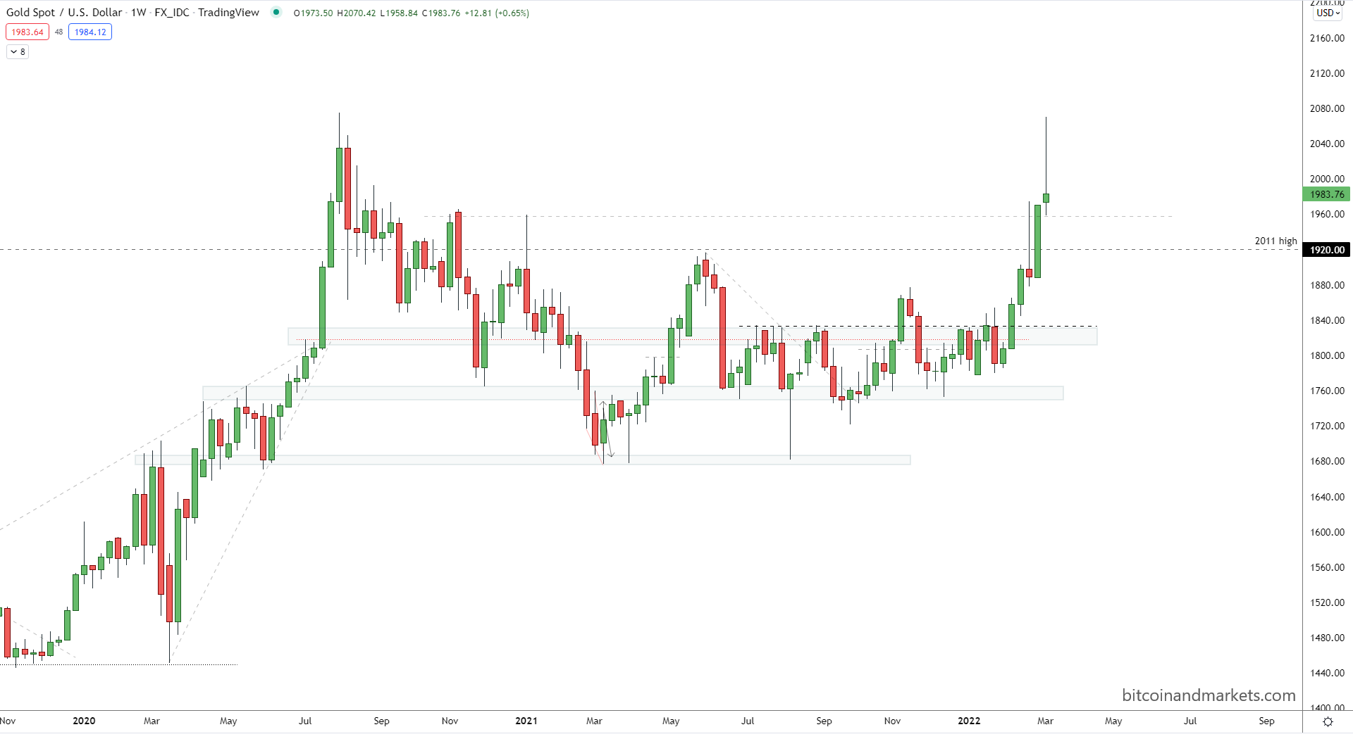 Oil is the one thing that hasn't performed as I predicted a year ago. It ran up to the third top like I was expecting, but really took off due to the Ukraine situation. Now, I think it is extremely overbought, and long-term should settle around $50/bbl.