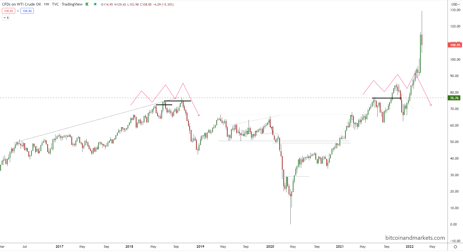 The chart just looks like a parabolic blow off top to me, very similar to 2008. Bubble territory. It's dangerous to call the top in a bubble, because price could run up to $200 before crashing. But a crash is coming, the fundamentals guarentee it. We have not entered a new paradigm of high priced oil. It took 12 weeks to fall 45% in 2018, and 6 months to fall 80% in 2008 (not shown).