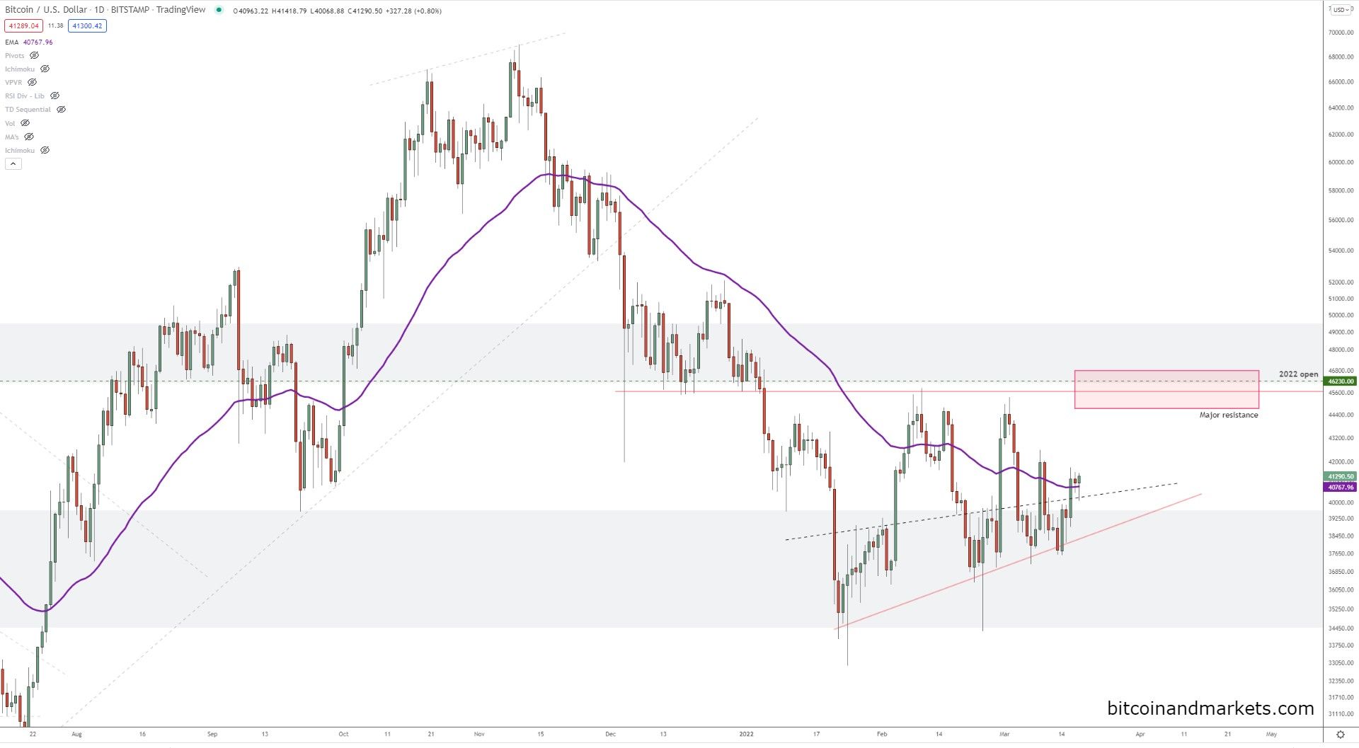 Last week, "I predict price to hold the lows from January, and remain bottled up in this range this week." That has happened pretty well. This week, my concern about the lower highs is the same, but we're in a fundamentally stronger position than last Friday. I expect price to test the high from March 9th of $42,600, and perhaps reach for the resistance zone at $45,900.