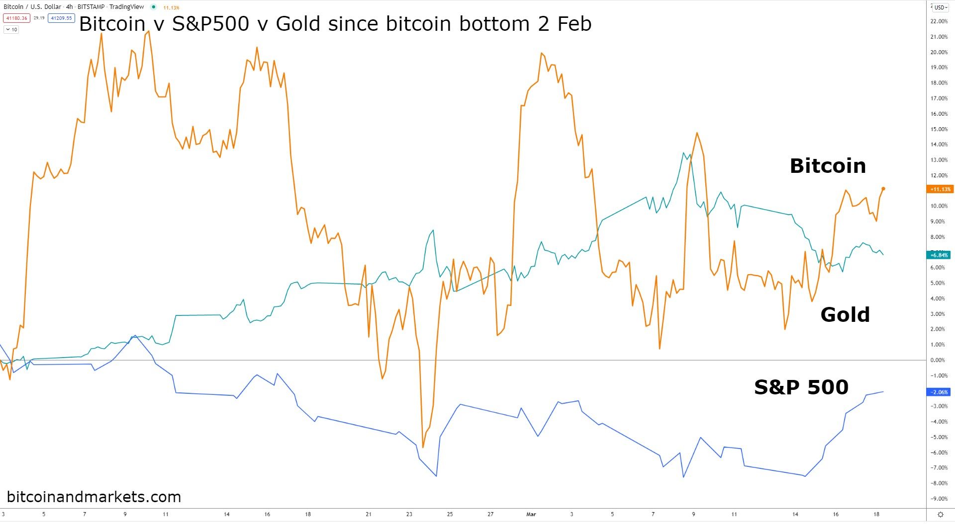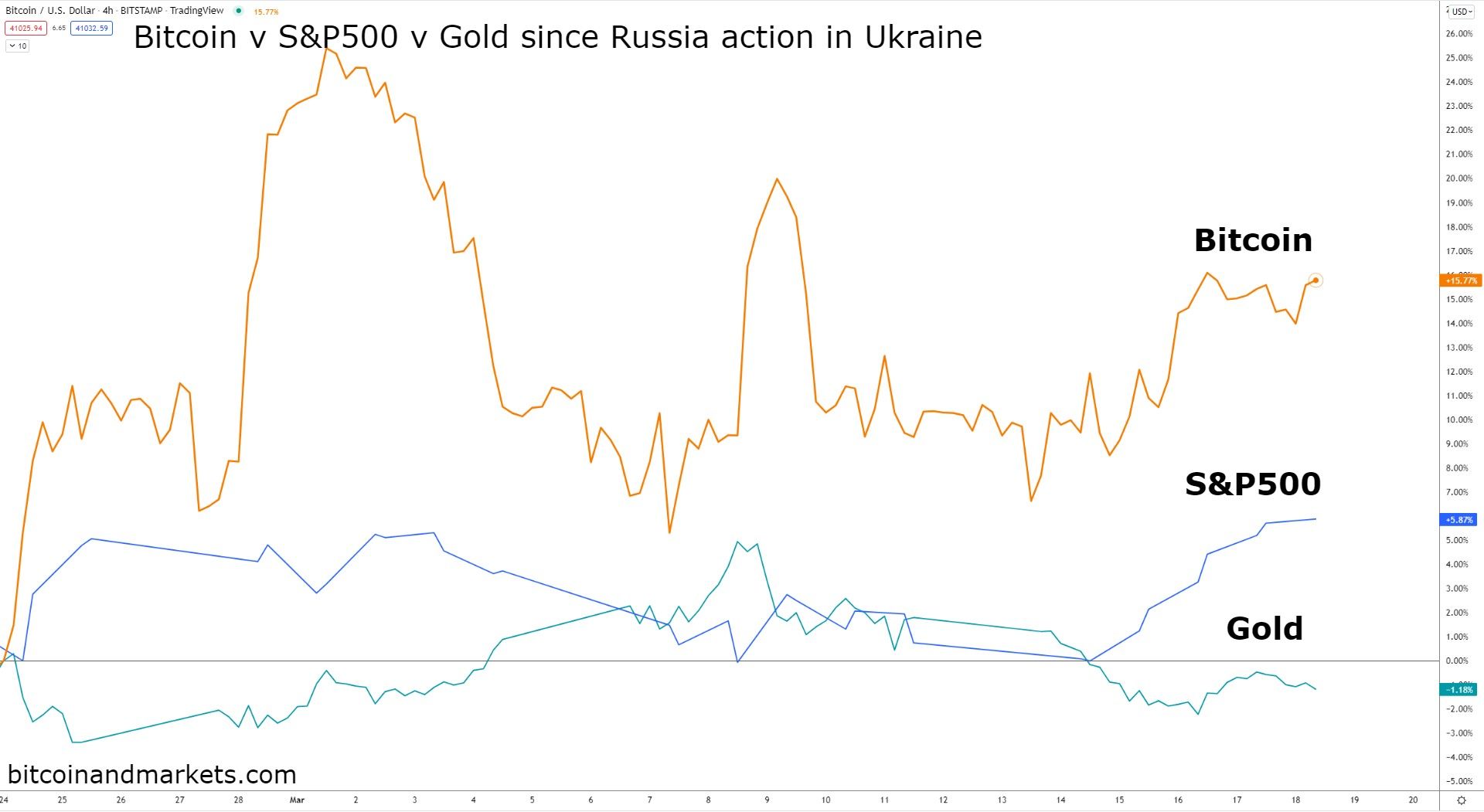 From bitcoin's bottom on Feb 2nd, which covers the whole Russia-Ukraine thing and the latest CPI print and Fed rate hike, the price is up 10.9%, the S&P 500 is down 3.2%, and gold is up only 6.9%.