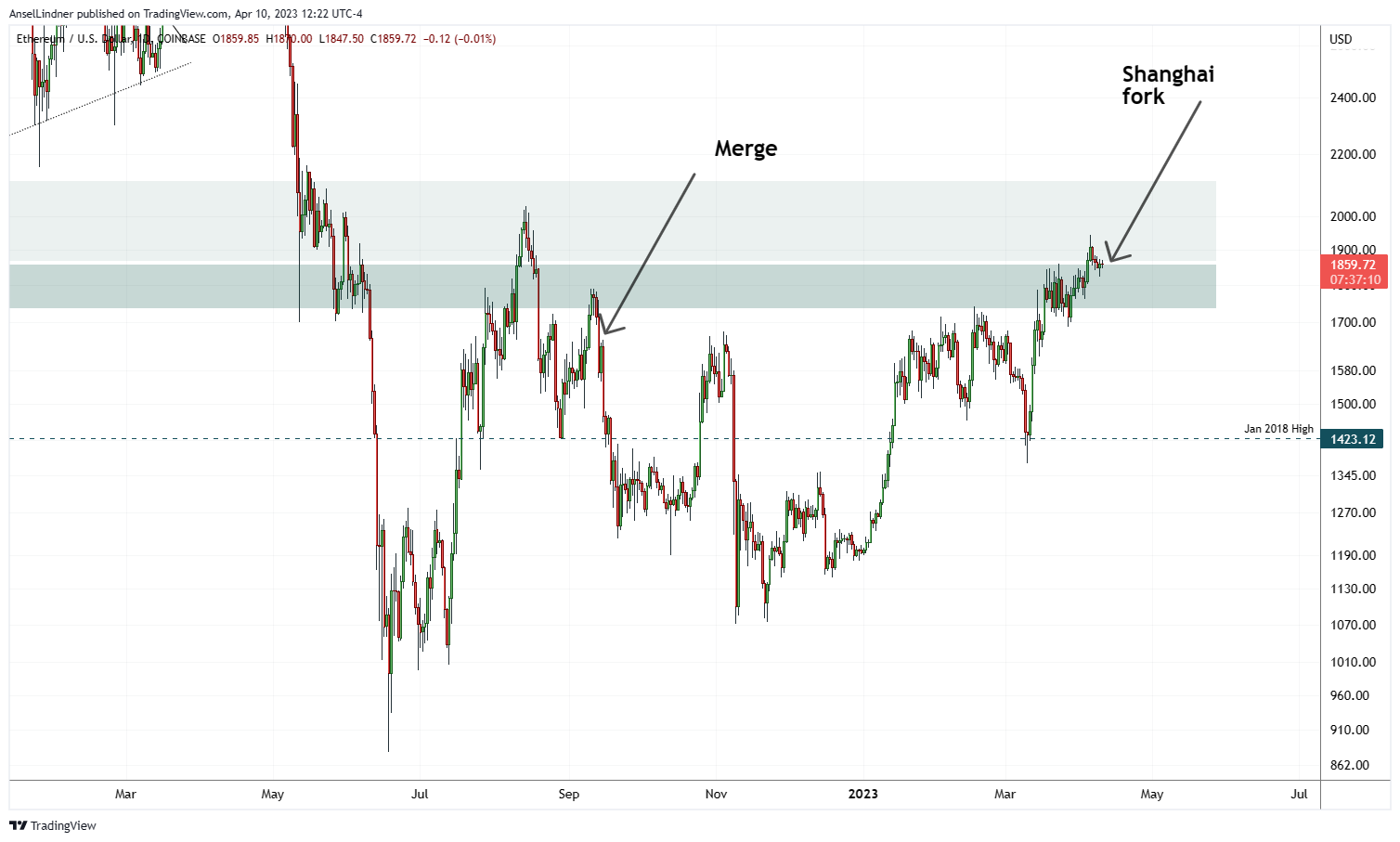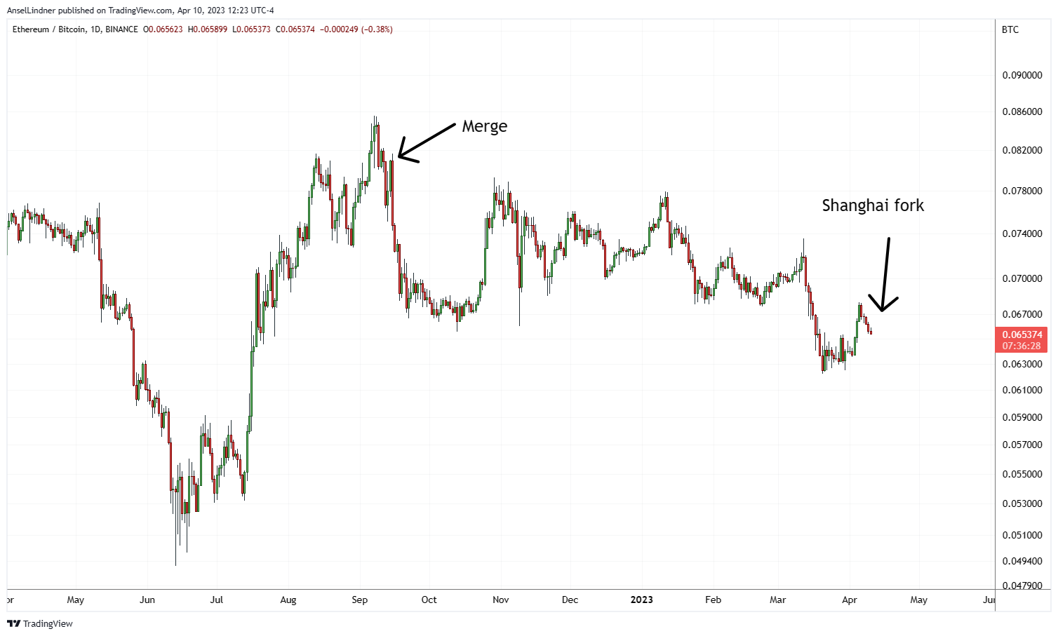Price typically pumps going into a hard fork, and it becomes a sell the news event. Below is the ETH/USD price and the ETH/BTC price, leading up to the Merge and Shanghai.