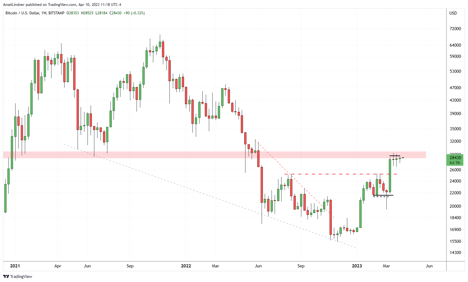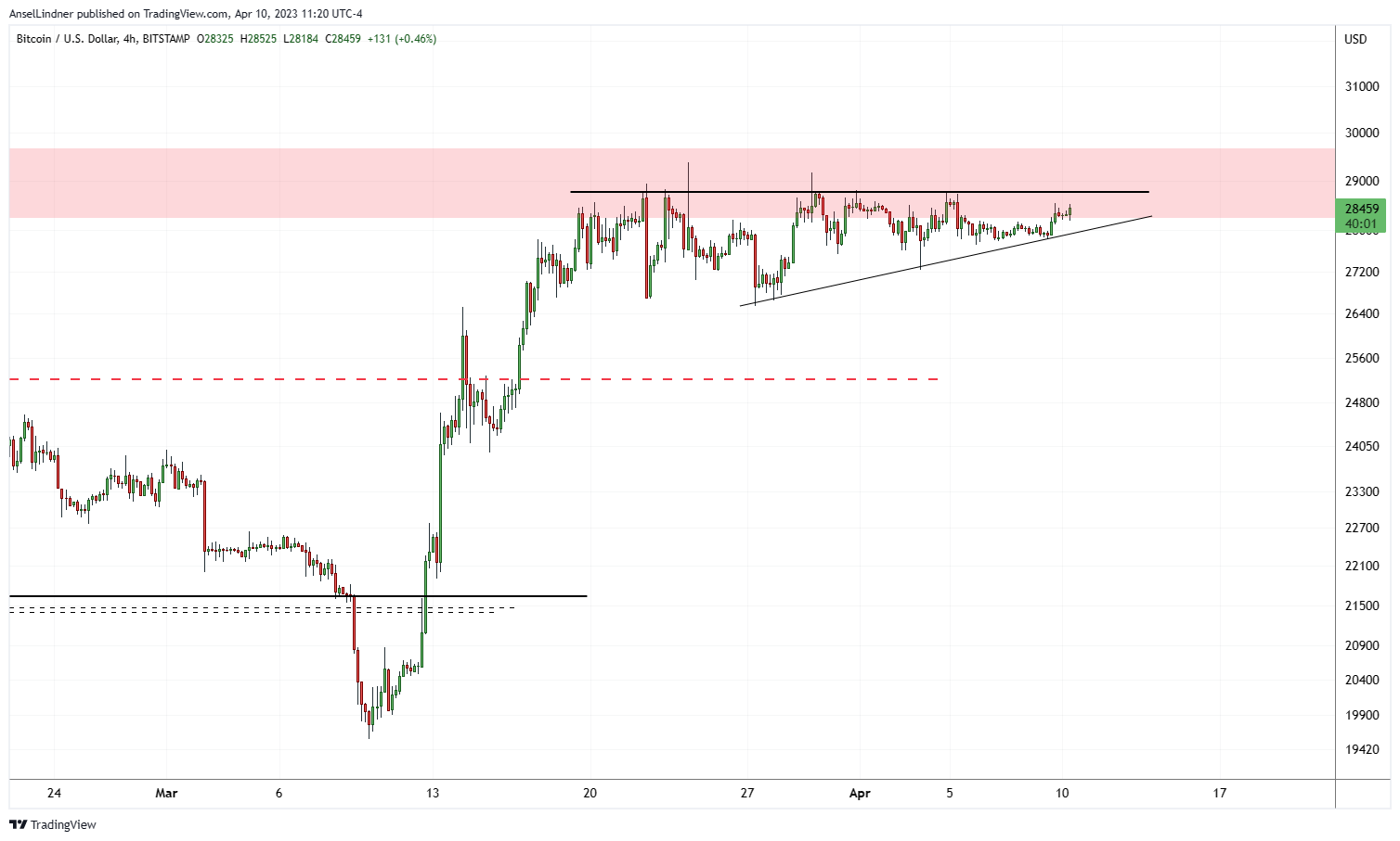 If we zoom into the 4-hour chart, we can see the complete sideways movement over the last week. The same black horizontal line in the red at $28,750 from last week is still providing resistance now. If we can break that, we are set to move higher.
