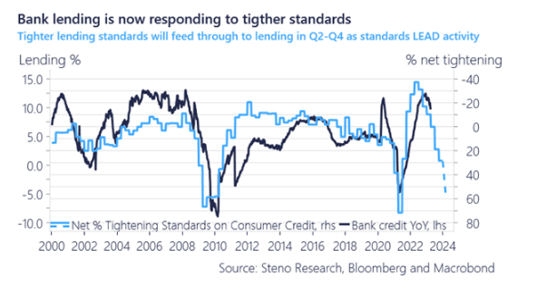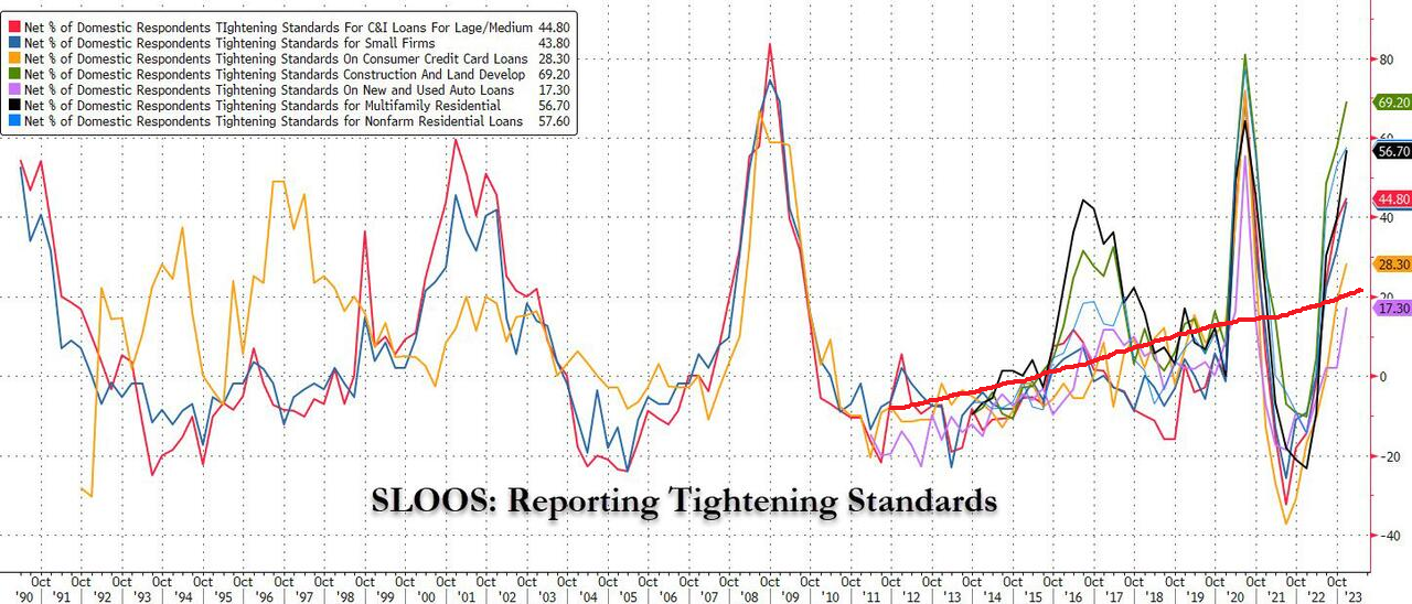 Below I drew a very crude line as an average. Notice, lending standards have been getting tighter for a long time. Gradually tightening lending standards is part of the "post-GFC normal". What we've seen recently is fluctuation around the mean.