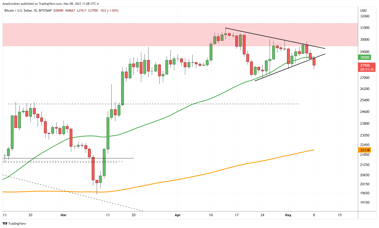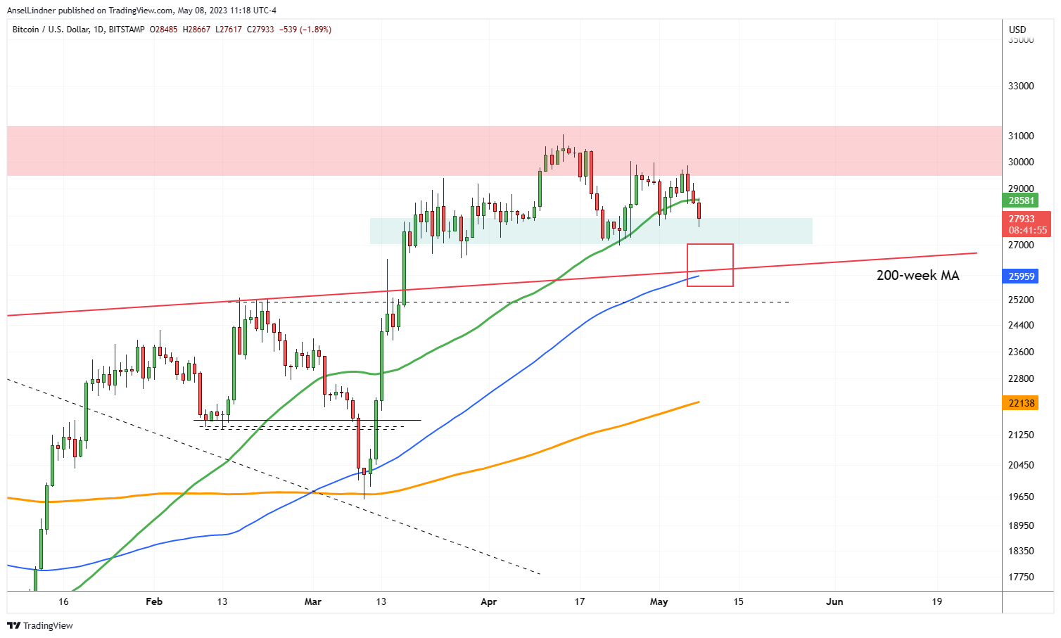 I do not expect this to be a major dip. $27,000 has been a very strong area for the price in the last couple of months (green shaded area below). The red box is where several important support levels come together and the most likely place for a bounce if there is a further sell off.
